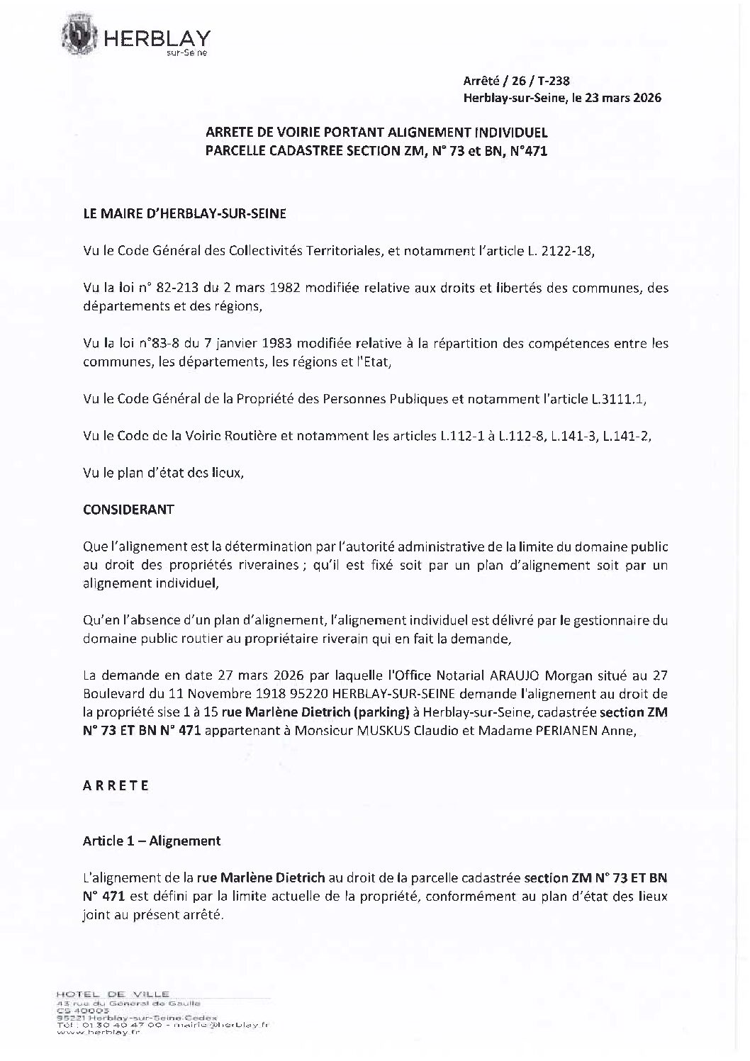 Arrêté de voirie portant alignement individuel parcelle cadastrée section ZM N° 73 et BN N° 471
