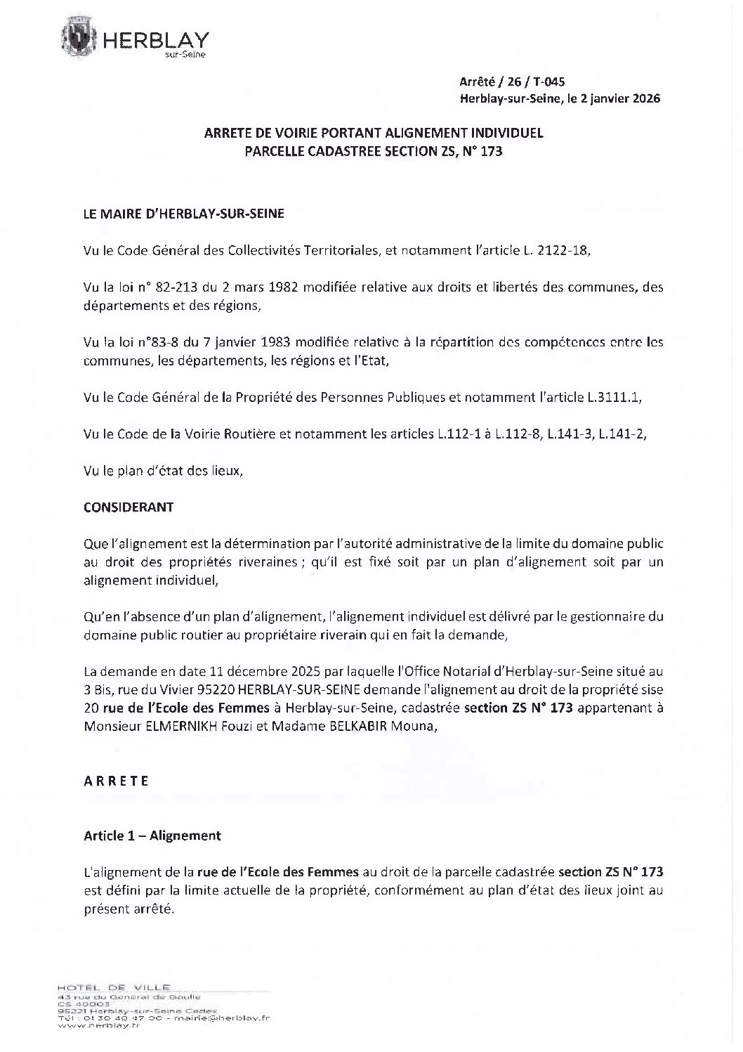 Arrêté de voirie portant alignement individuel parcelle cadastrée section ZS N° 173