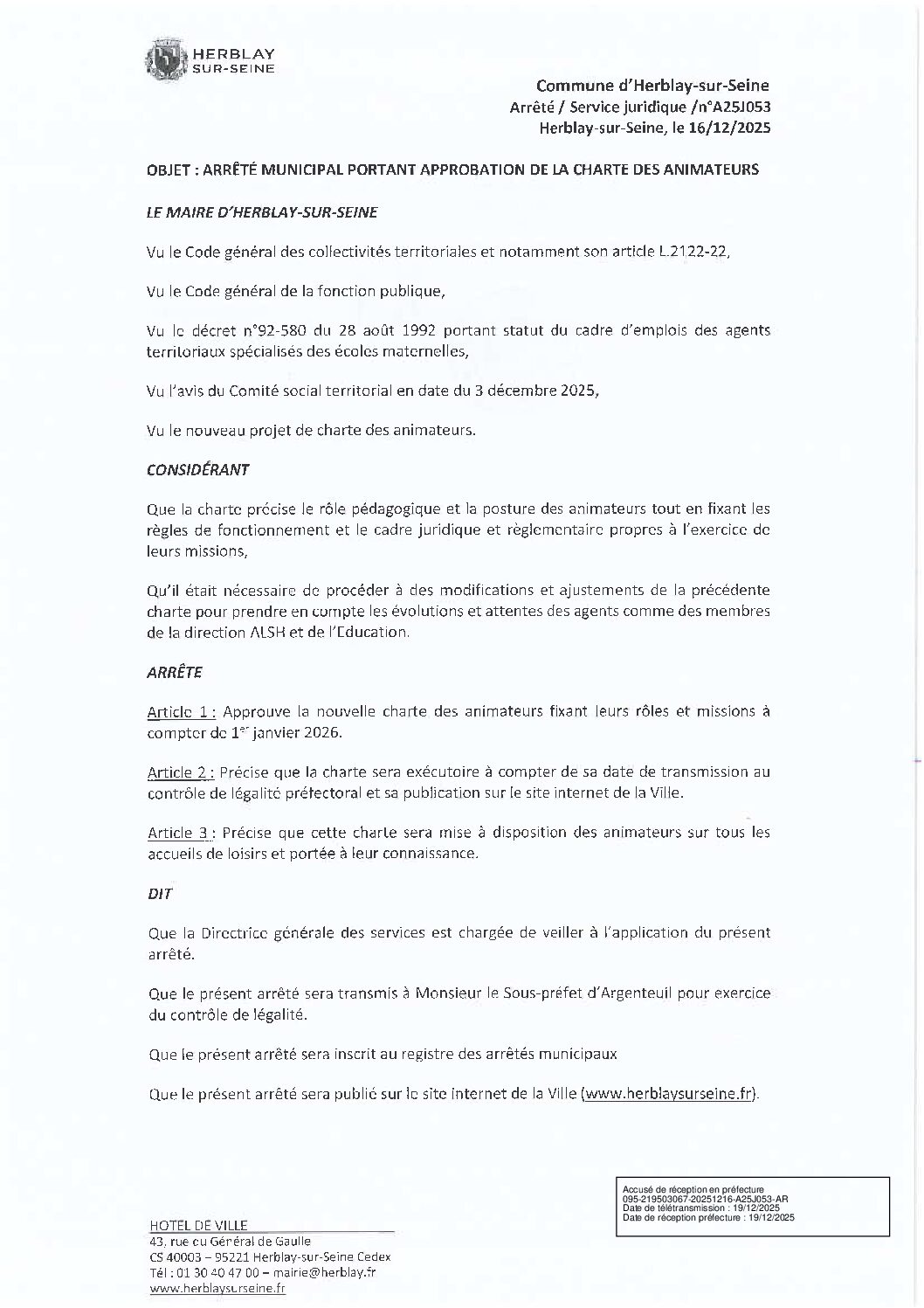 Arrêté municipal portant approbation de la charte des animateurs