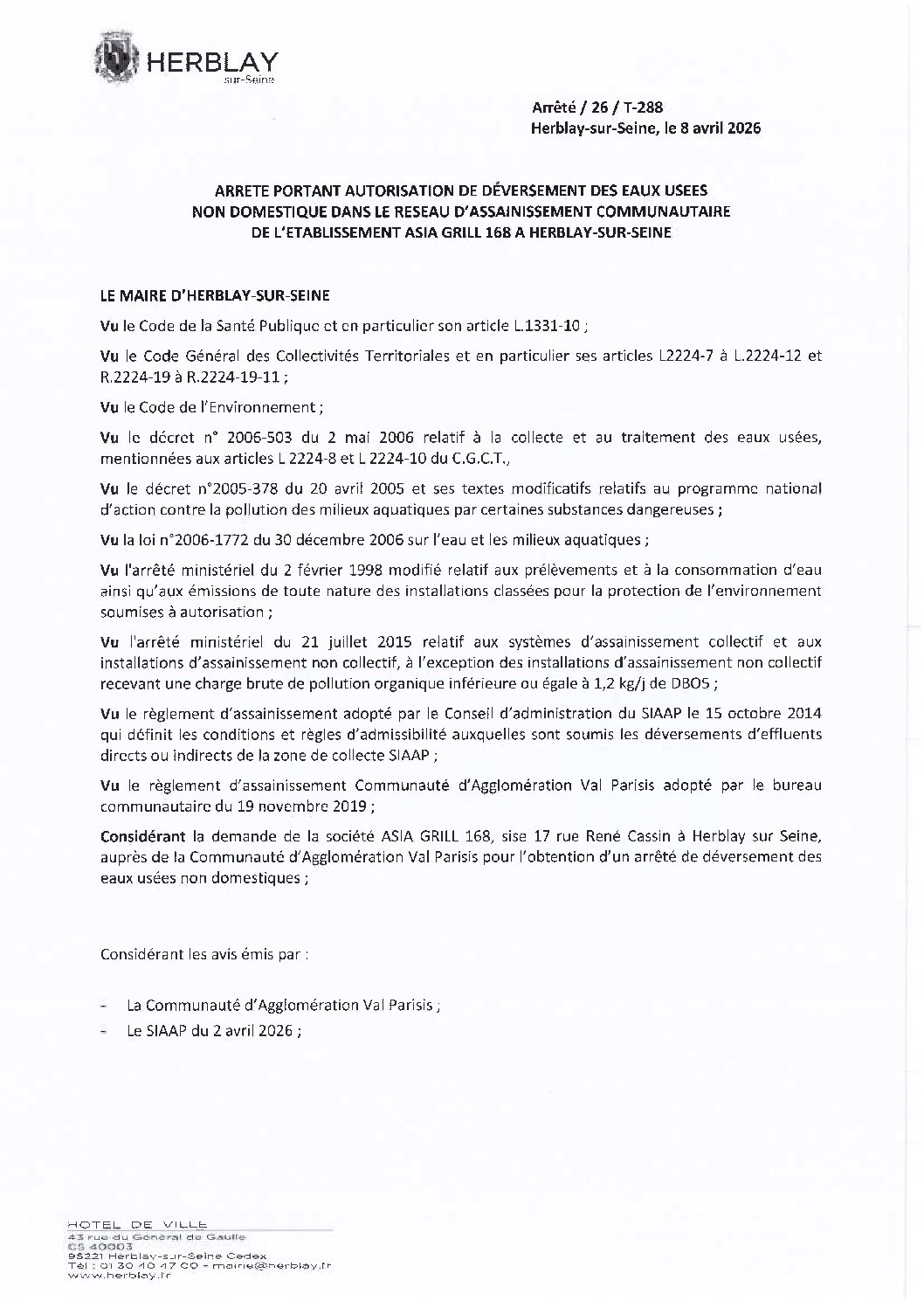 Arrêté portant autorisation de déversement des eaux usées non domestique dans le réseau d’assainissement communautaire de l’établissement ASIA GRILL 168A