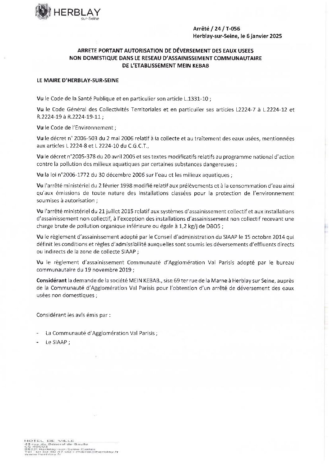 Arrêté portant autorisation de déversement des eaux usées non domestique dans le réseau d’assainissement communautaire de l’établissement MEIN KEBAB