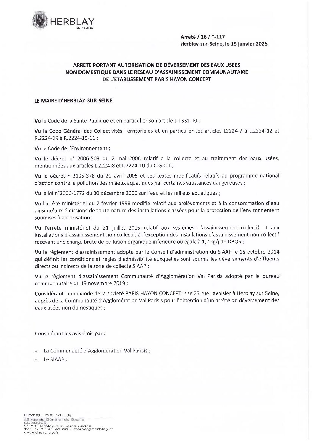 Arrêté portant autorisation de déversement des eaux usées non domestique dans le réseau d’assainissement communautaire de l’établissement PARIS HAYON CONCEPT