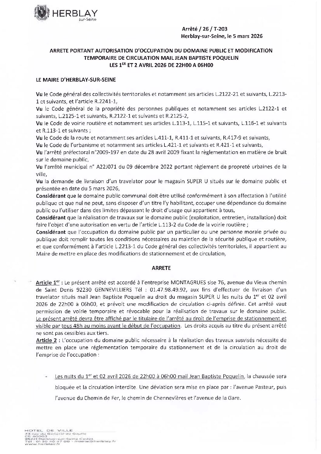 Arrêté portant autorisation d’occupation du domaine public et modification temporaire de circulation mail Jean-Baptiste Poquelin