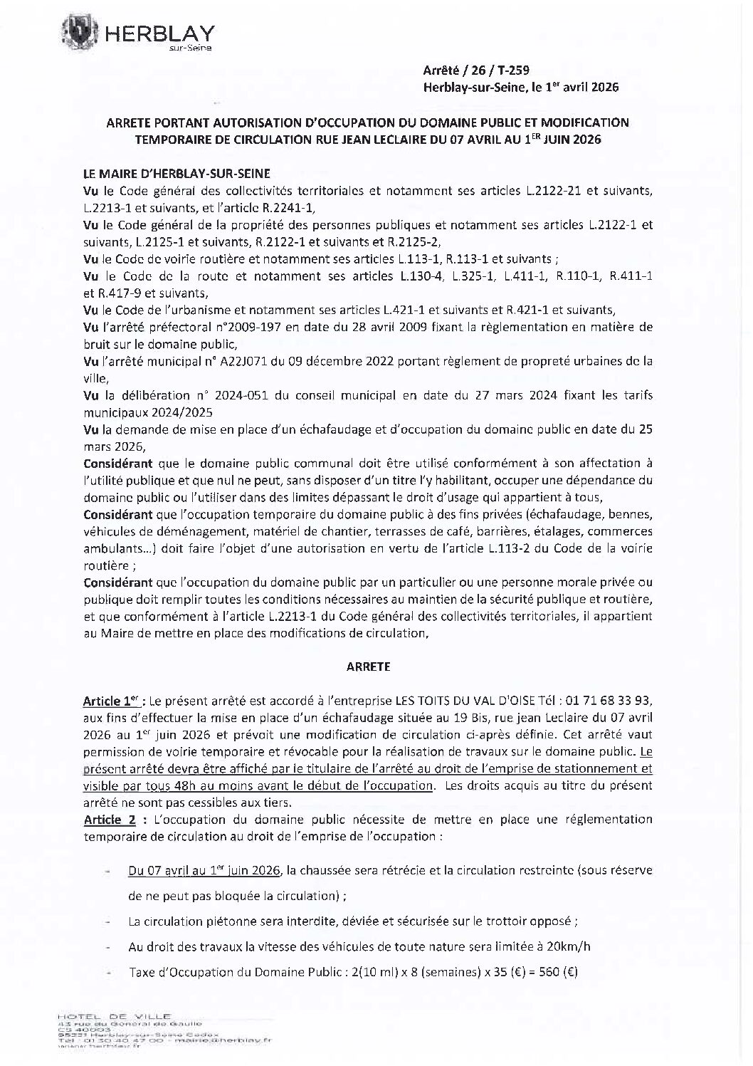 Arrêté portant autorisation d’occupation du domaine public et modification temporaire de circulation rue Jean Leclaire