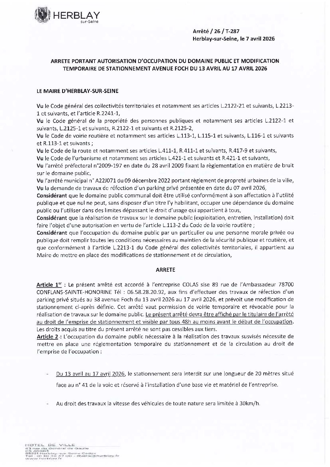 Arrêté portant autorisation d’occupation du domaine public et modification temporaire de stationnement avenue Foch