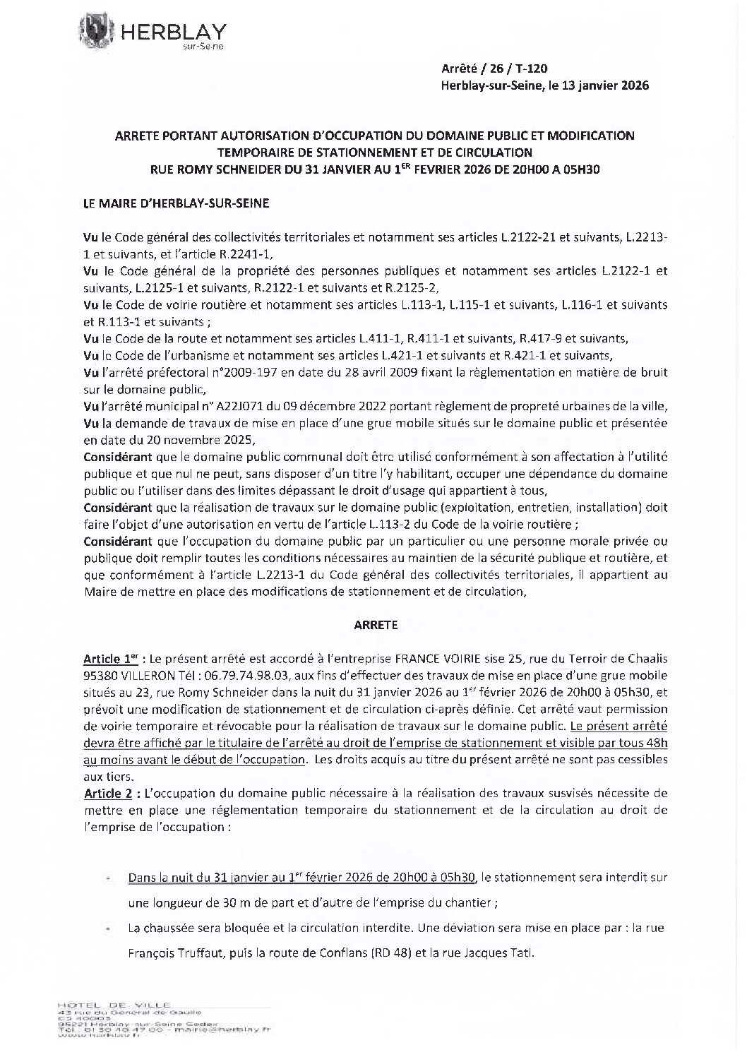 Arrêté portant autorisation d’occupation du domaine public et modification temporaire de stationnement et de circulation rue Romy Schneider
