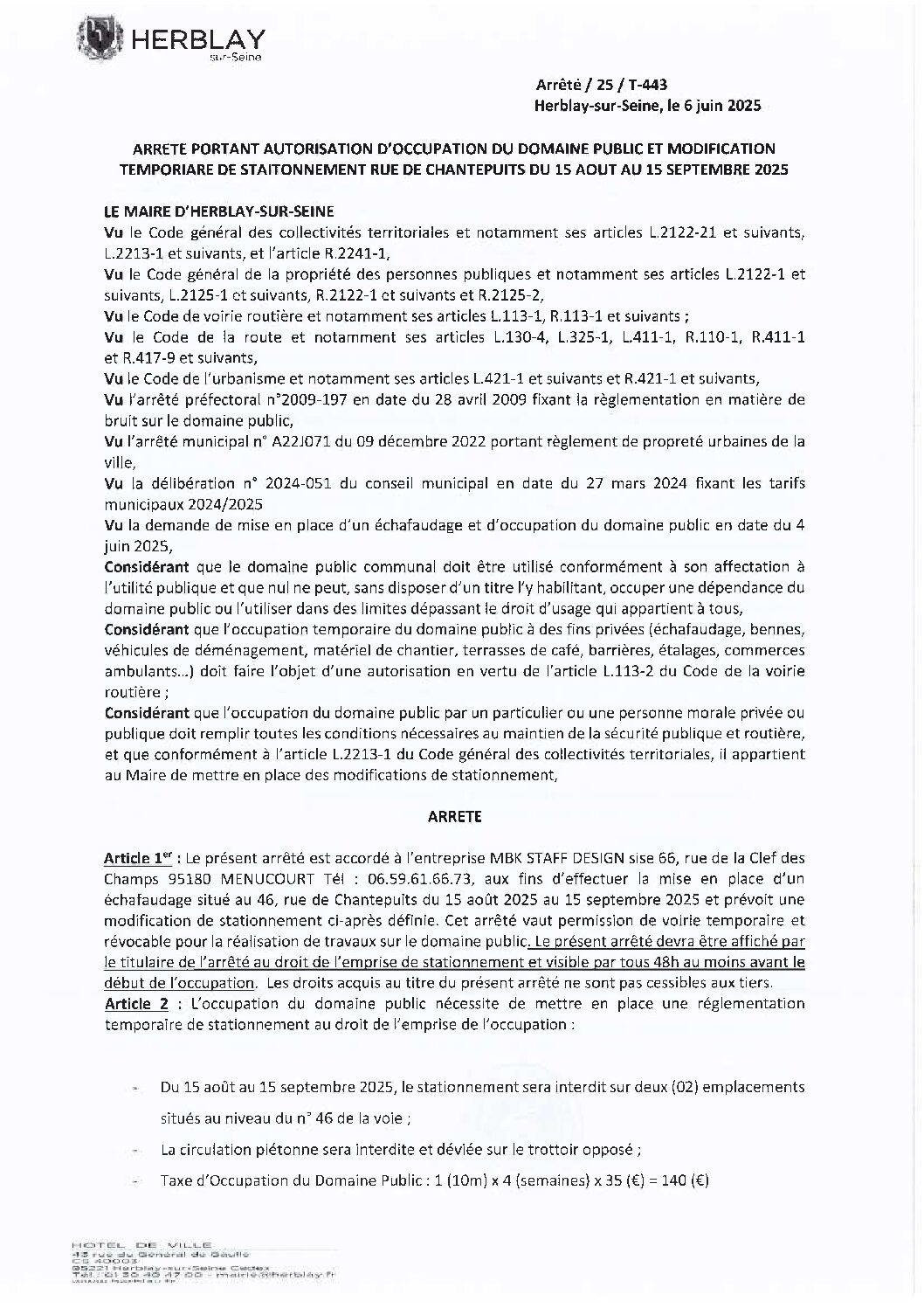 Arrêté portant autorisation d’occupation du domaine public et modification temporaire de stationnement rue de Chantepuits