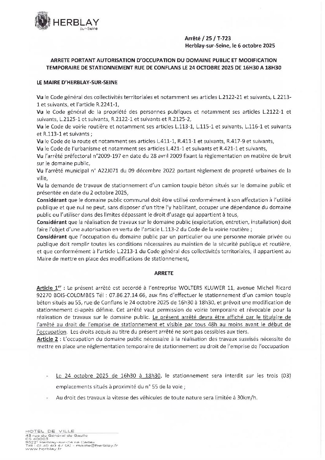 Arrêté portant autorisation d’occupation du domaine public et modification temporaire de stationnement rue de Conflans