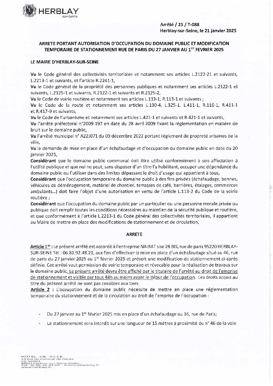 Arrêté portant autorisation d’occupation du domaine public et modification temporaire de stationnement rue de Paris
