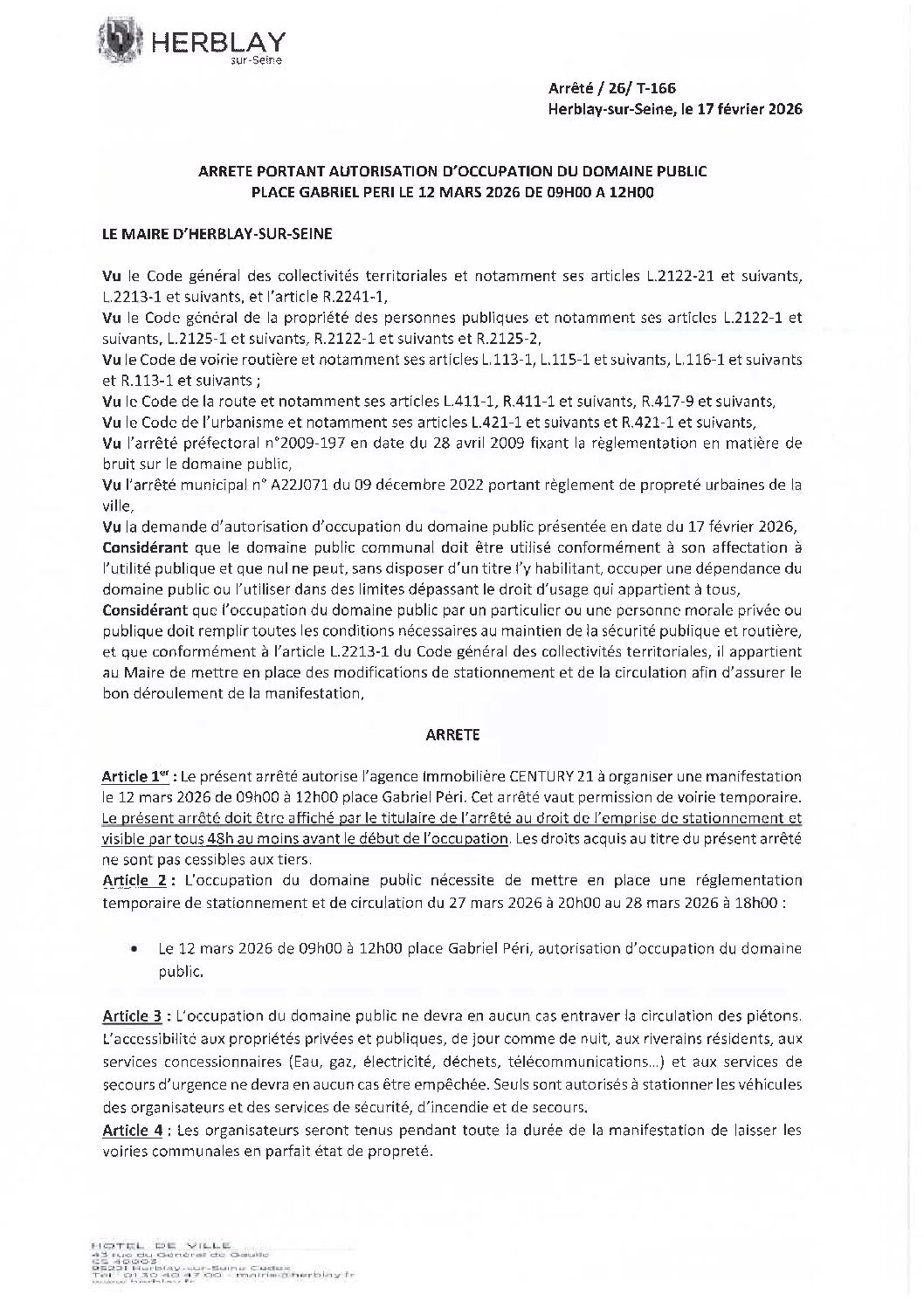 Arrêté portant autorisation d’occupation du domaine public place Gabriel Péri