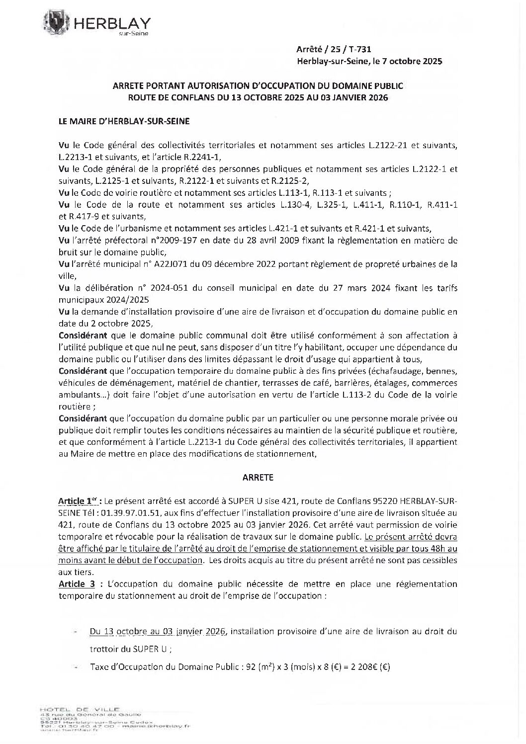 Arrêté portant autorisation d’occupation du domaine public route de Conflans