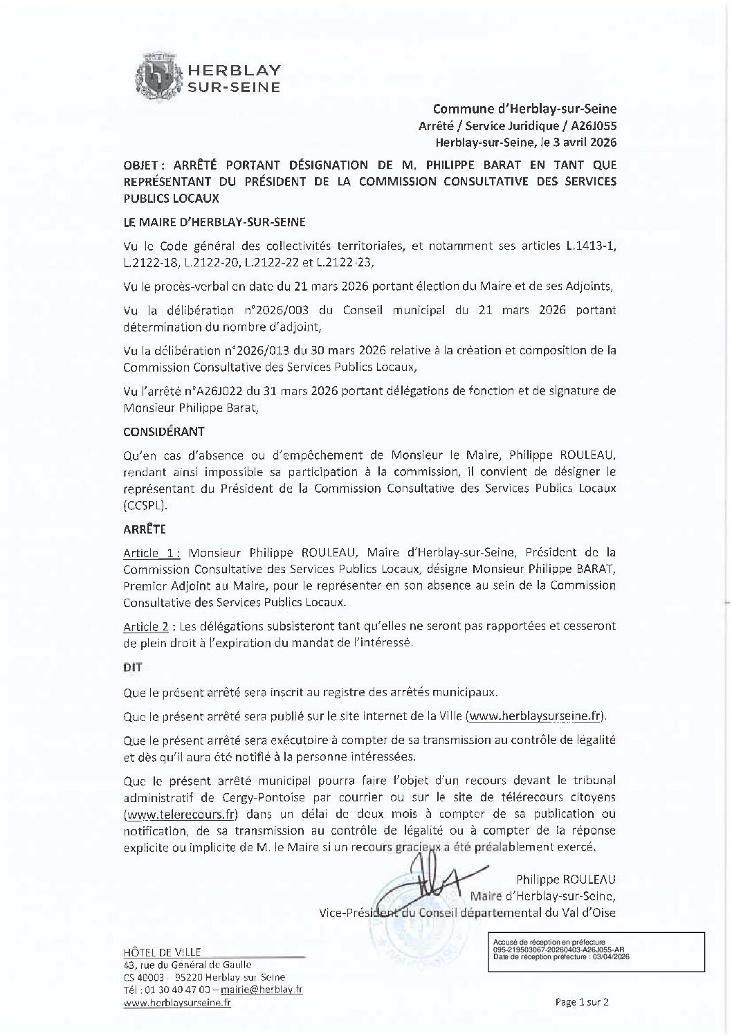 Arrêté portant désignation de M. Philippe BARAT en tant que représentant du Président de la Commission Consultative des Services Publics Locaux