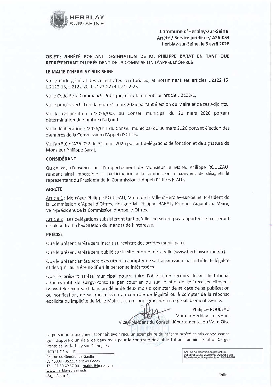 Arrêté portant désignation de M. Philippe BARAT en tant que représentant du Président de la Commission d’Appel d’Offres