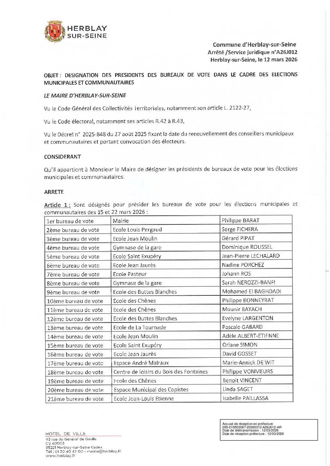 Arrêté portant désignation des présidents des bureaux de vote dans le cadre des élections municipales et communautaires