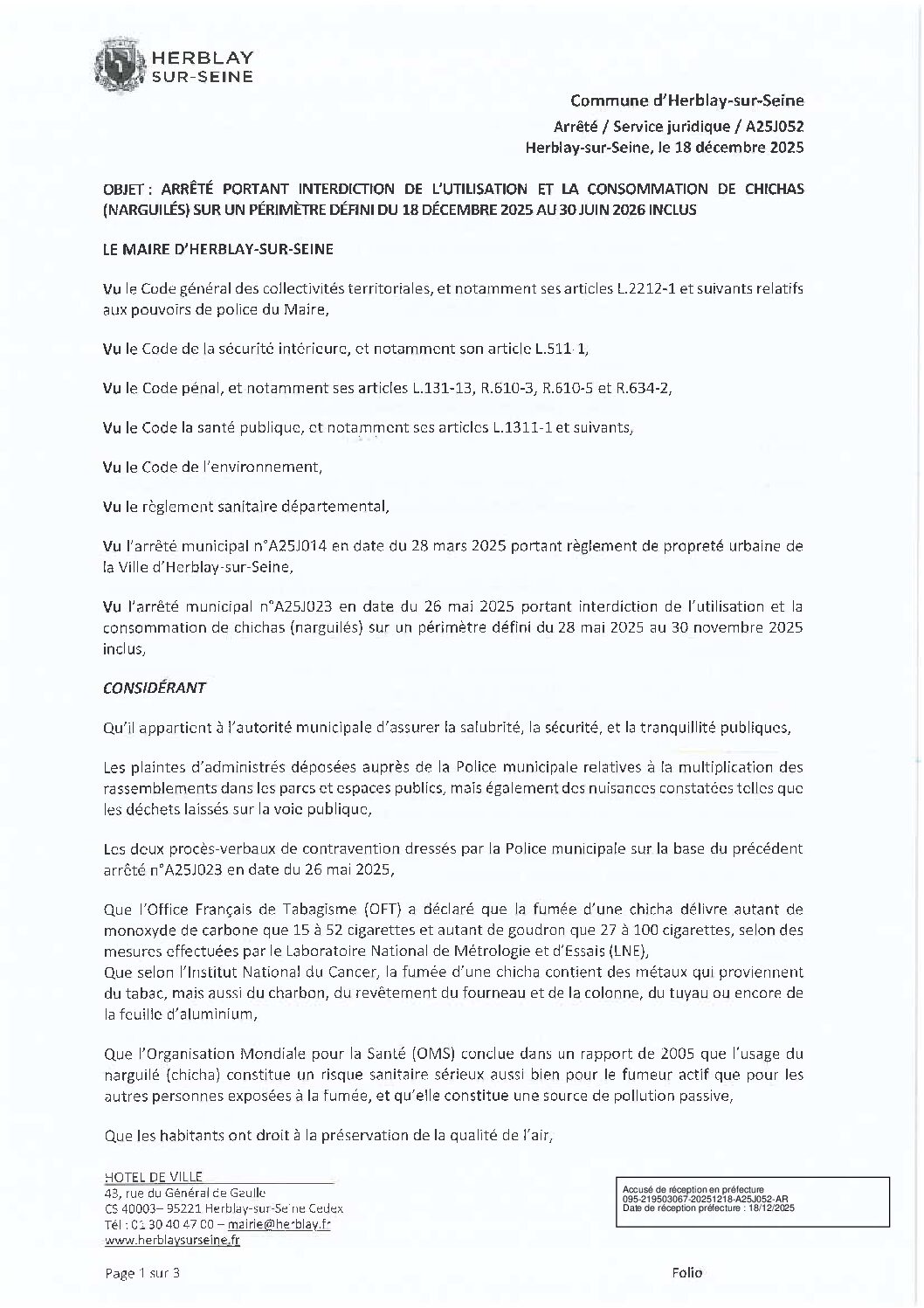 Arrêtés : Arrêté portant interdiction de l’utilisation et la consommation de chichas (narguilés) sur un périmètre défini du 18 décembre 2025 au 30 juin 2026 inclus 18/12/2025