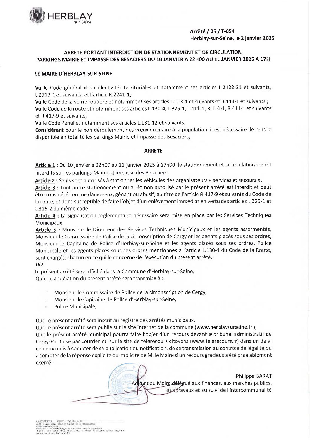 Arrêté portant interdiction de stationnement et de circulation parkings Mairie et impasse des Besaciers