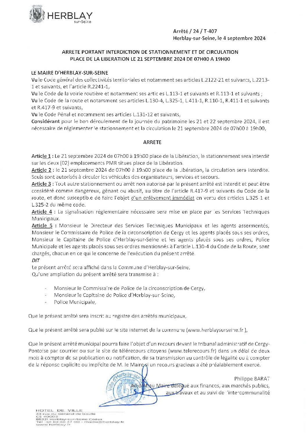 Arrêté portant interdiction de stationnement et de circulation place de la Libération