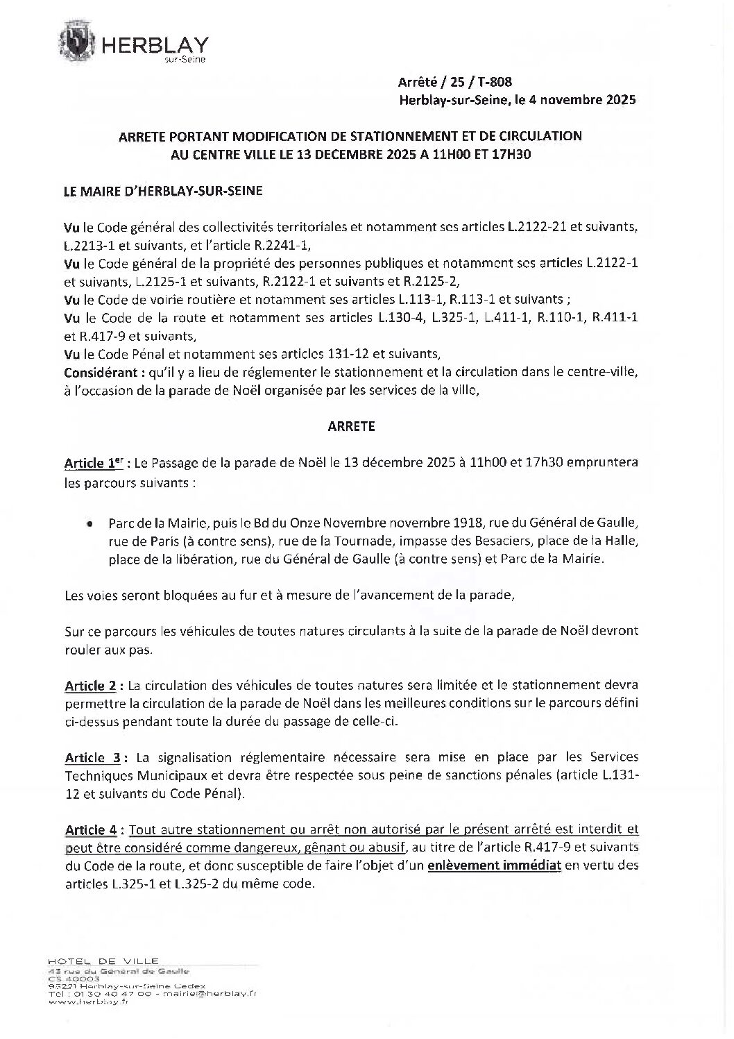 Arrêté portant modification de stationnement et de circulation au centre ville
