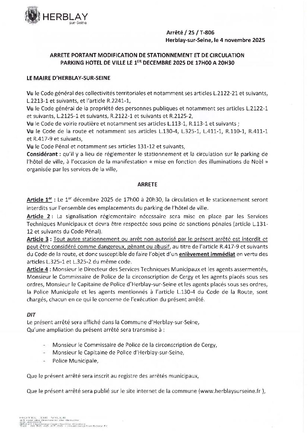 Arrêté portant modification de stationnement et de circulation parking Hôtel de Ville