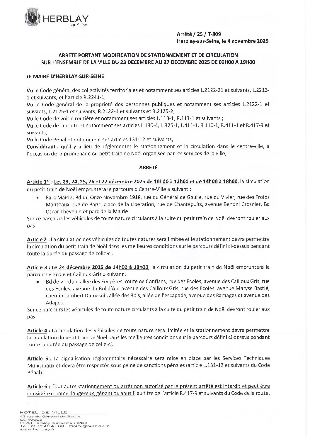 Arrêté portant modification de stationnement et de circulation sur l’ensemble de la ville