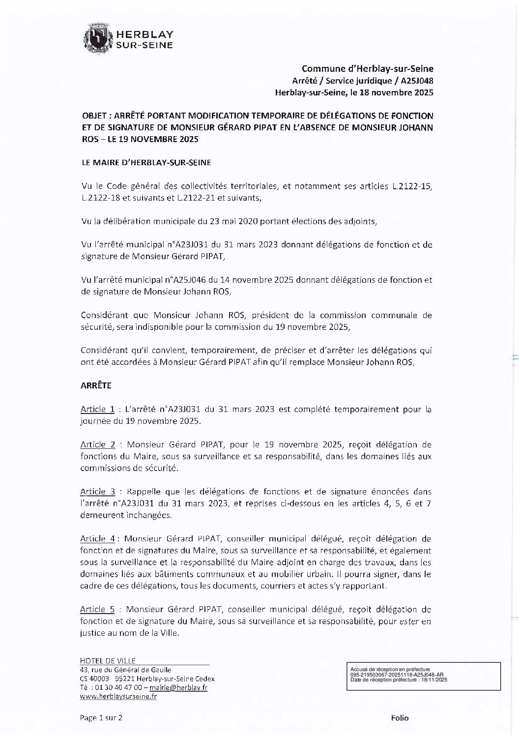Arrêté portant modification temporaire de délégations de fonction et de signature de Monsieur Gérard PIPAT en l’absence de Monsieur Johann ROS – le 19 novembre 2025