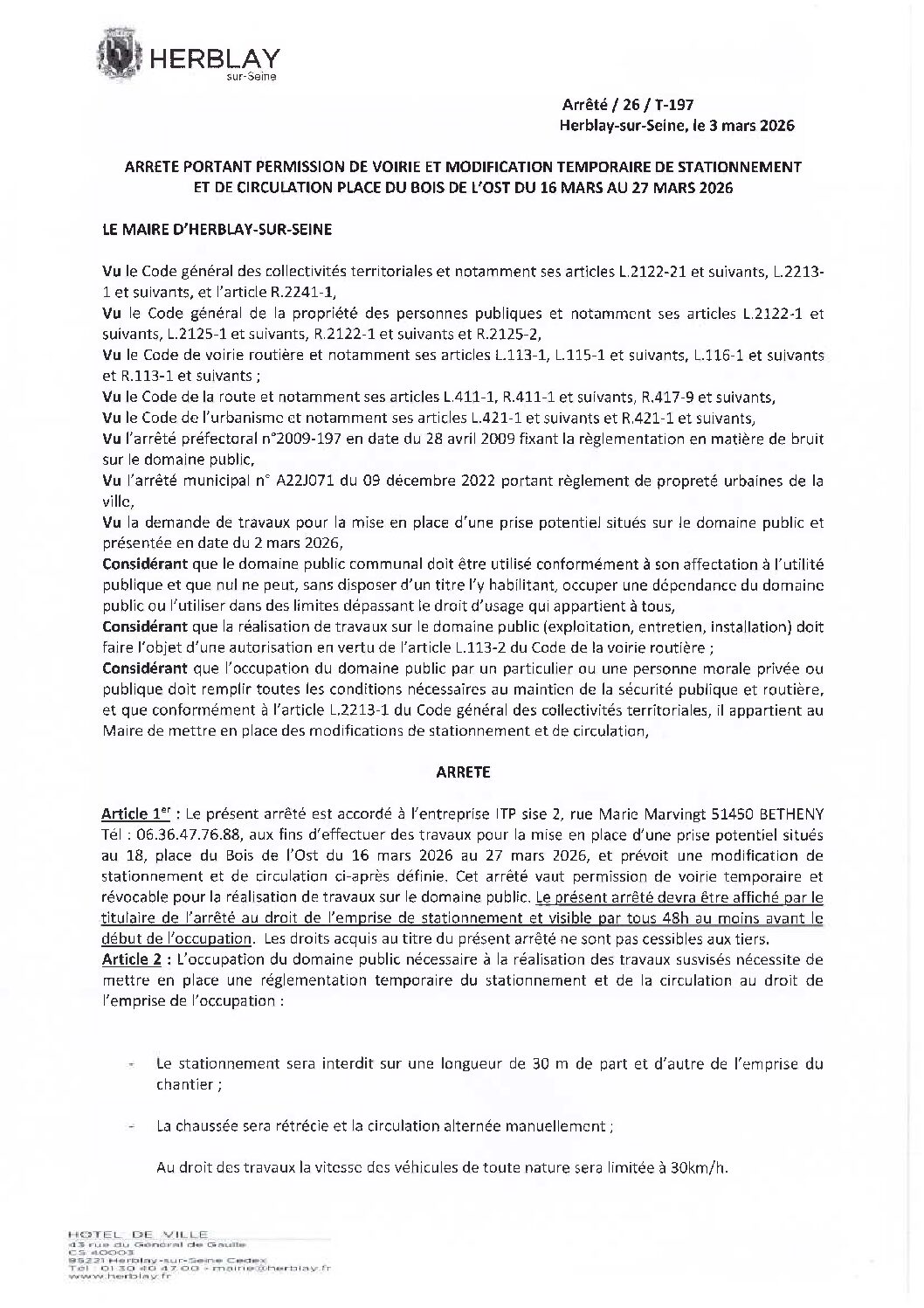 Arrêté portant permisison de voirie et modification temporaire de stationnement et de circulation place du Bois de l’Ost