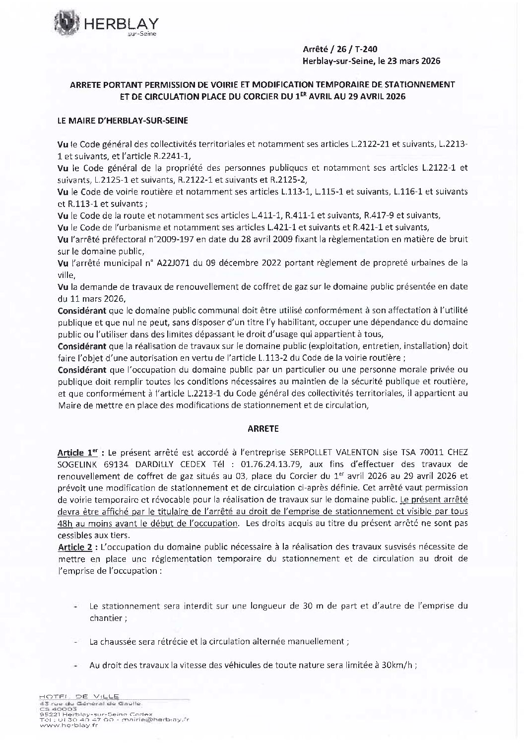 Arrêté portant permisison de voirie et modification temporaire de stationnement et de circulation place du Corcier