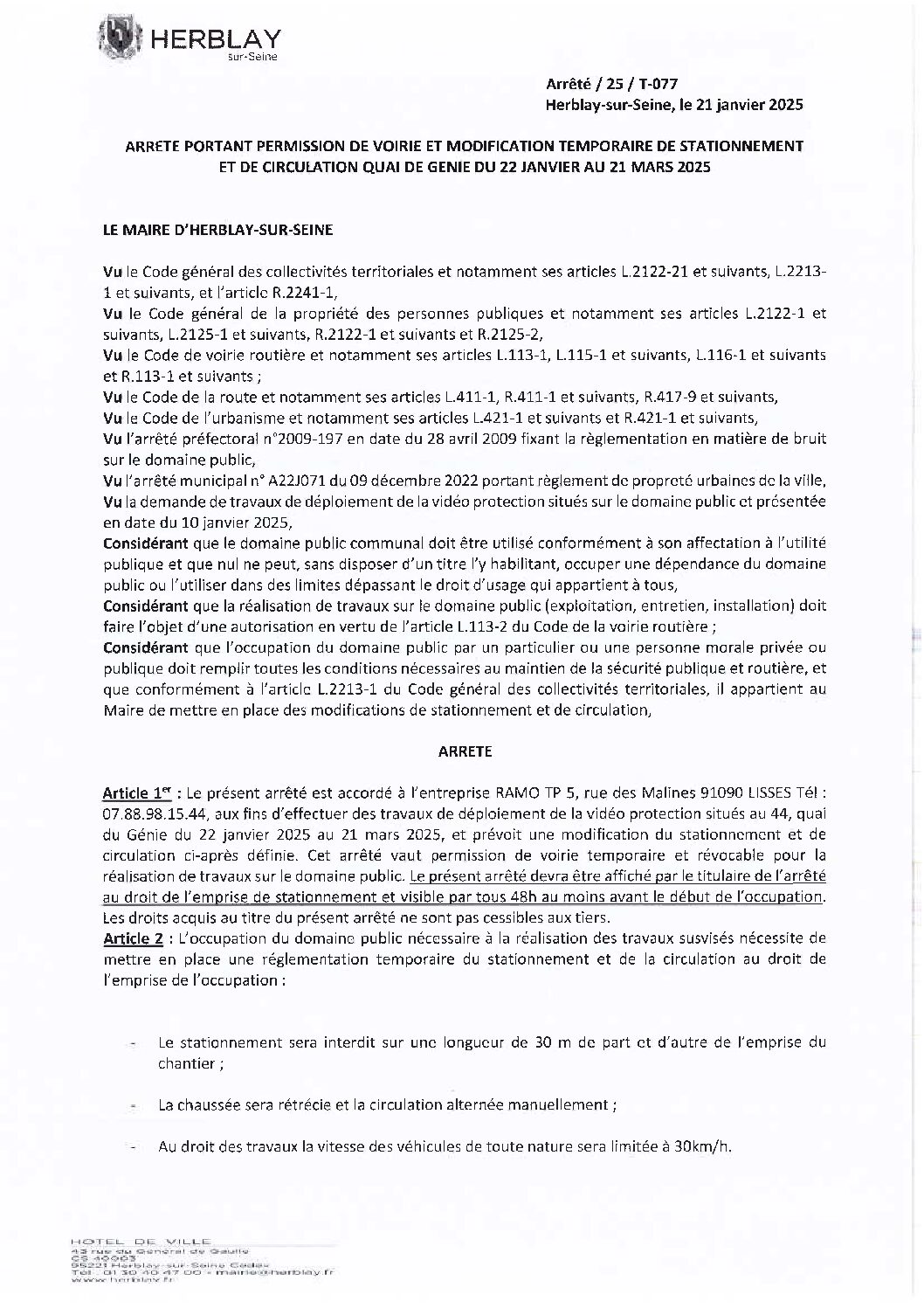Arrêté portant permission de voirie et modification temporaire d stationnement et de circulation quai du Génie