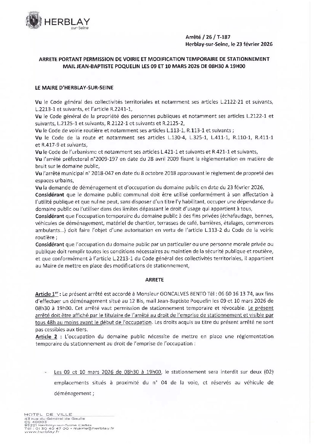 Arrêté portant permission de voirie et modification temporaire d stationnement mai Jean Baptiste Poquelin