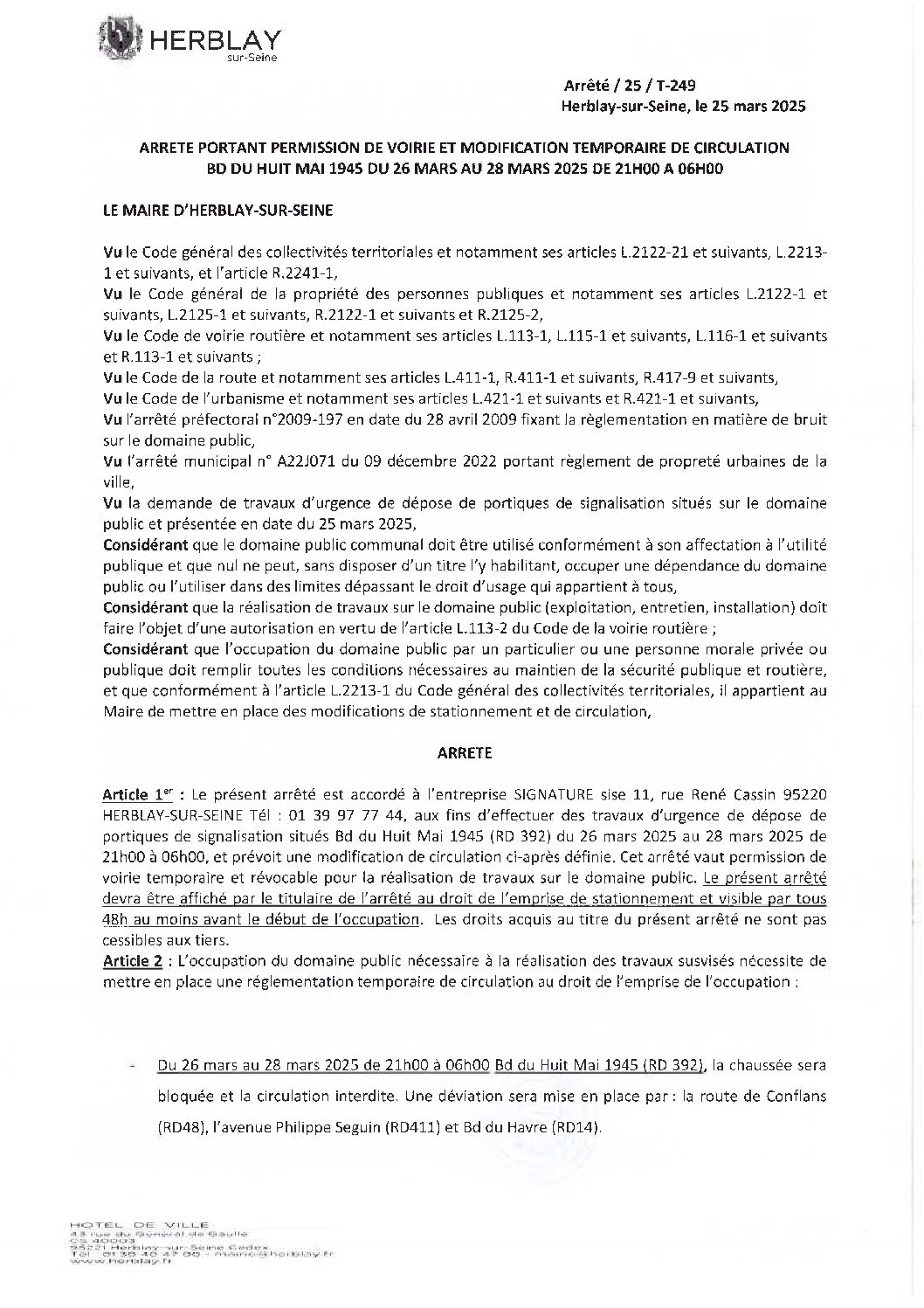 Arrêté portant permission de voirie et modification temporaire de circulation BD du Huit Mai 1945