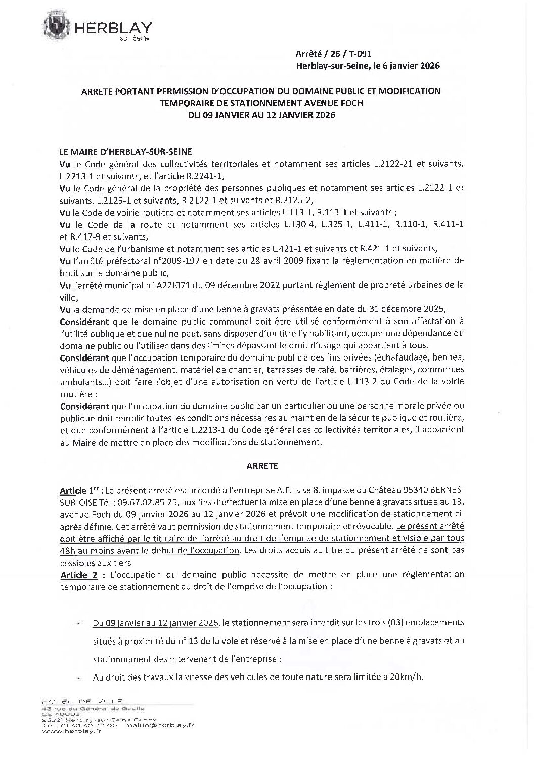 Arrêté portant permission de voirie et modification temporaire de stationnement avenue Foch