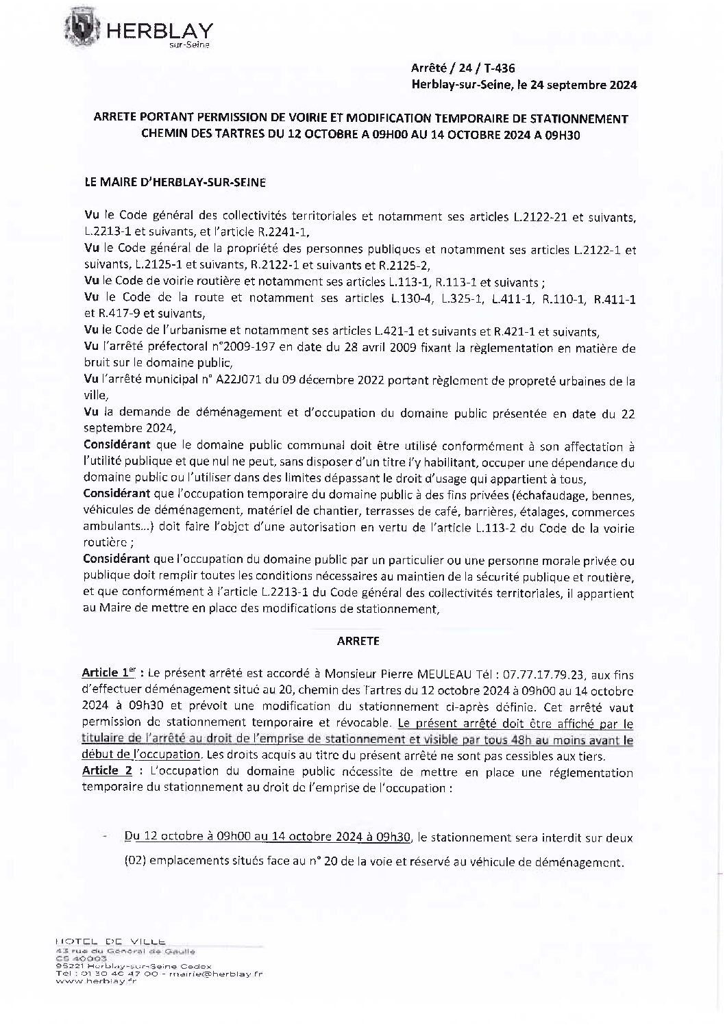 Arrêté portant permission de voirie et modification temporaire de stationnement chemin des Tartres