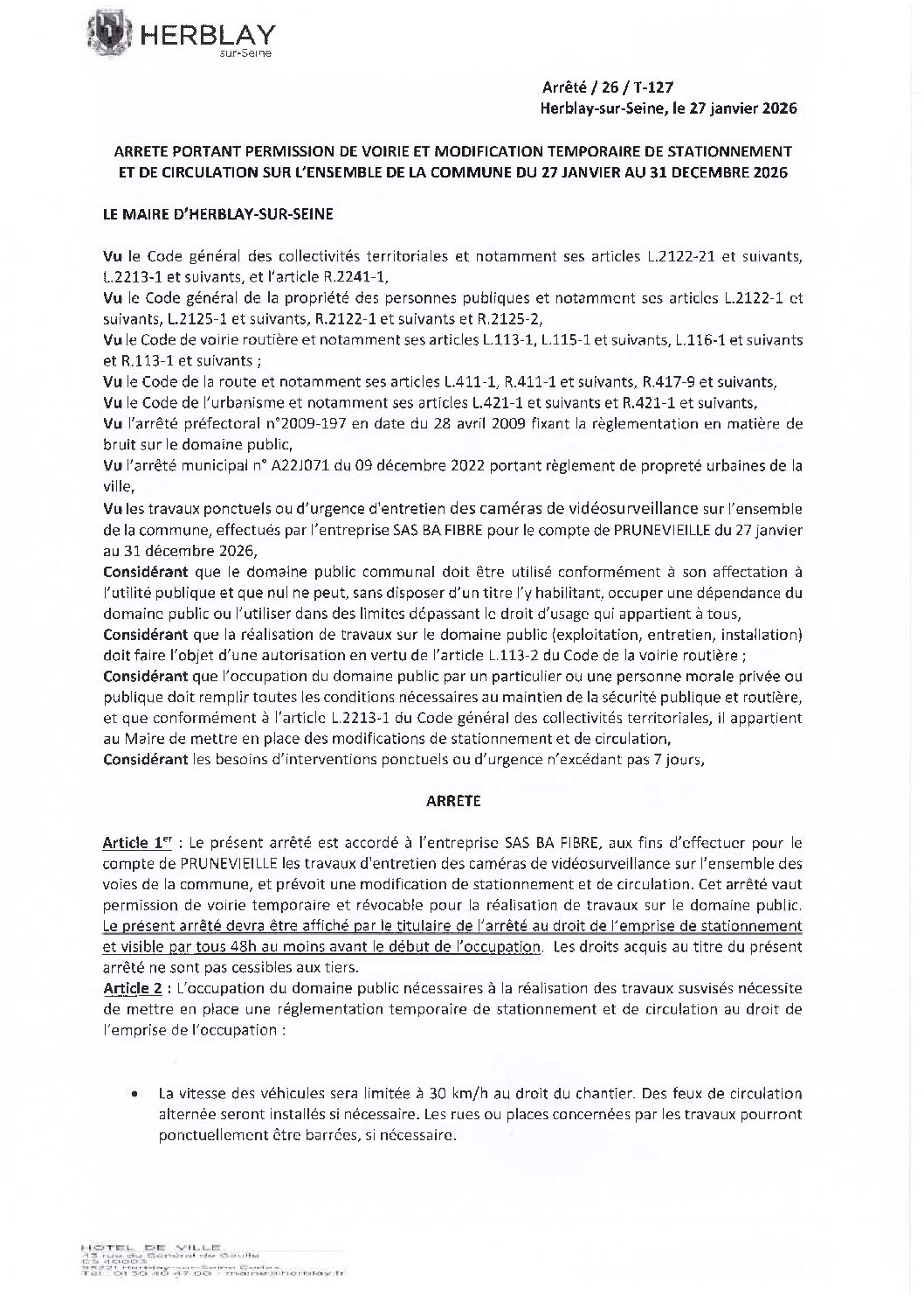 Arrêté portant permission de voirie et modification temporaire de stationnement et circulation sur l’ensemble de la commune