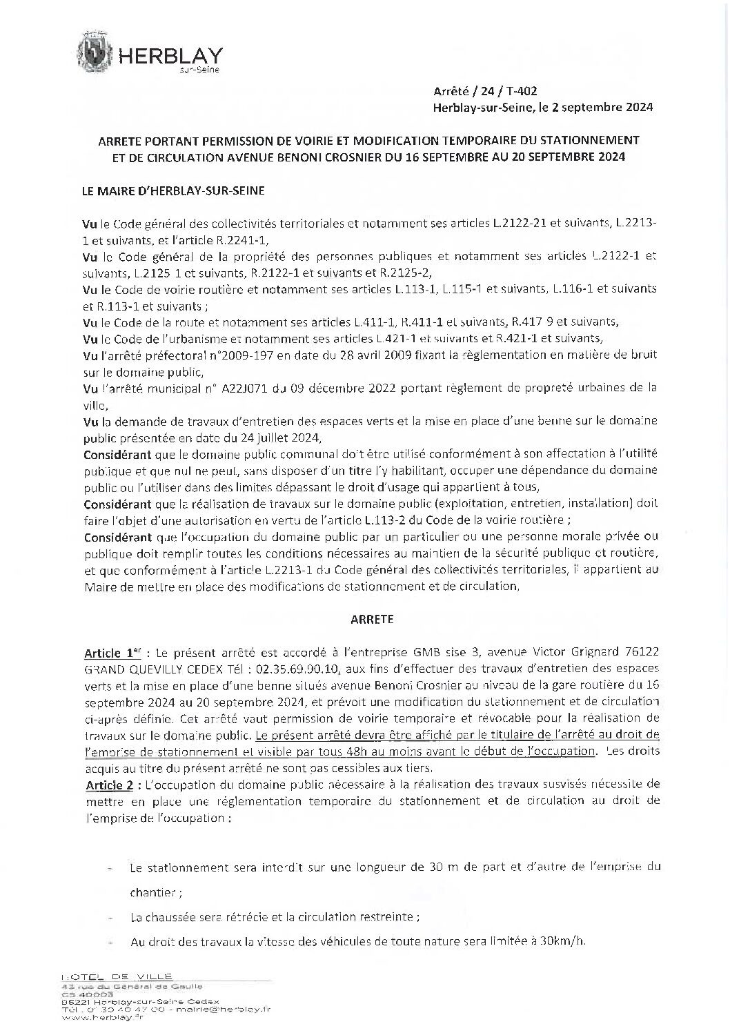 Arrêté portant permission de voirie et modification temporaire de stationnement et de circulation avenue Benoni Crosnier