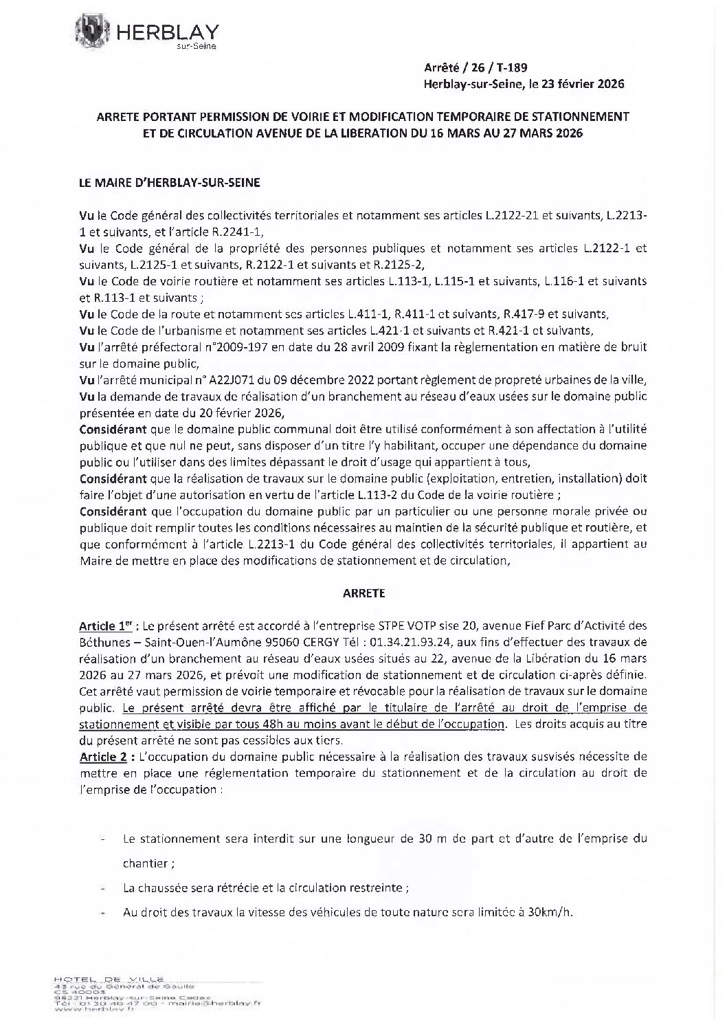 Arrêté portant permission de voirie et modification temporaire de stationnement et de circulation avenue de la Libération