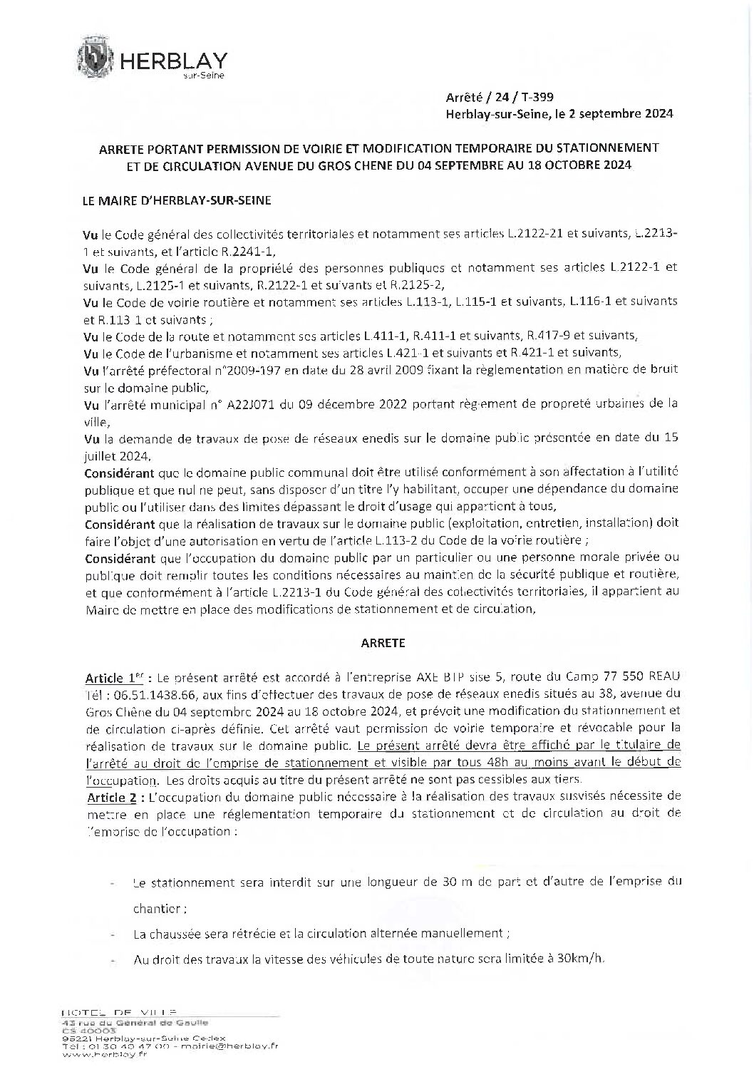 Arrêté portant permission de voirie et modification temporaire de stationnement et de circulation avenue du Gros Chêne