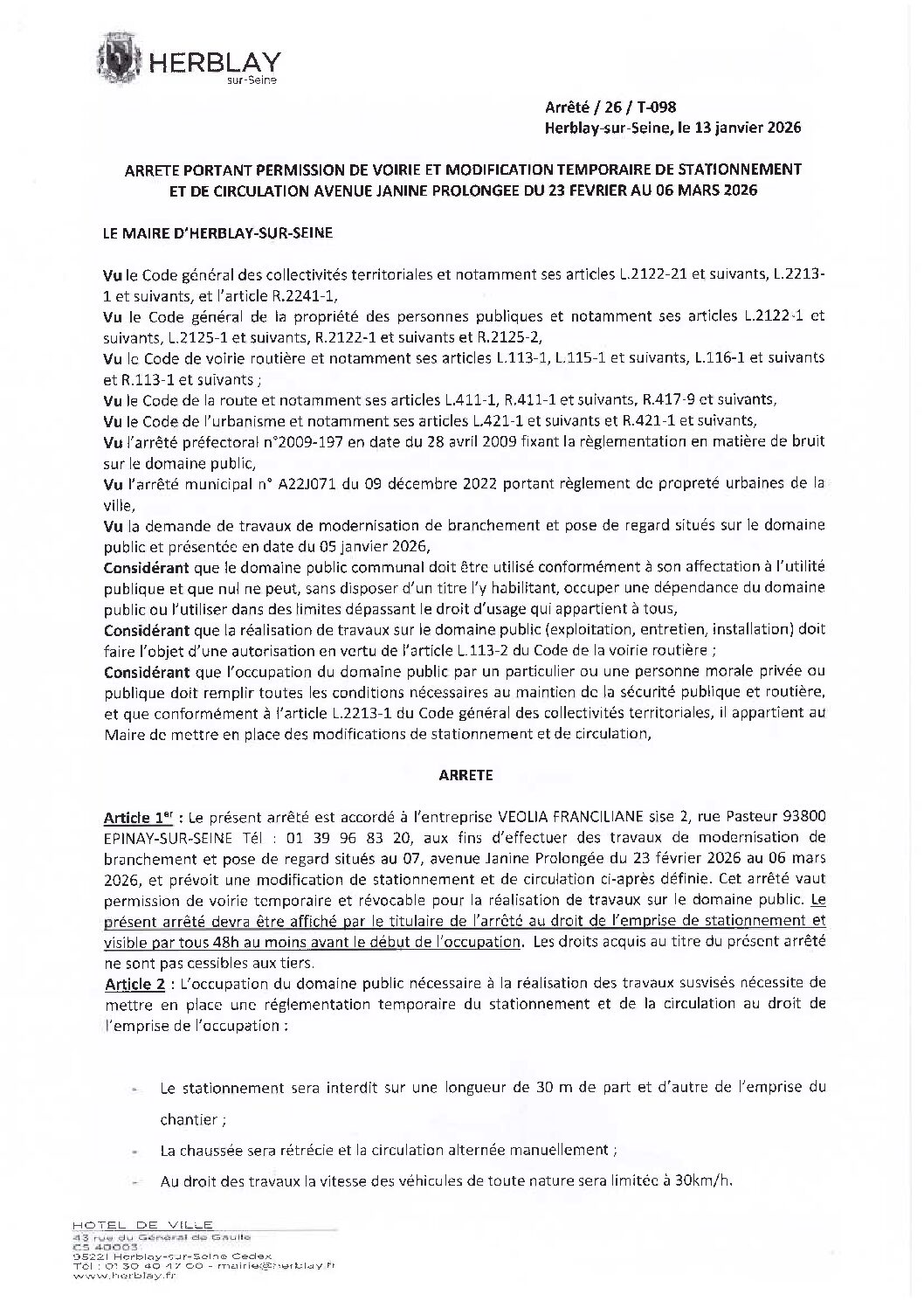 Arrêté portant permission de voirie et modification temporaire de stationnement et de circulation avenue Janine Prolongée