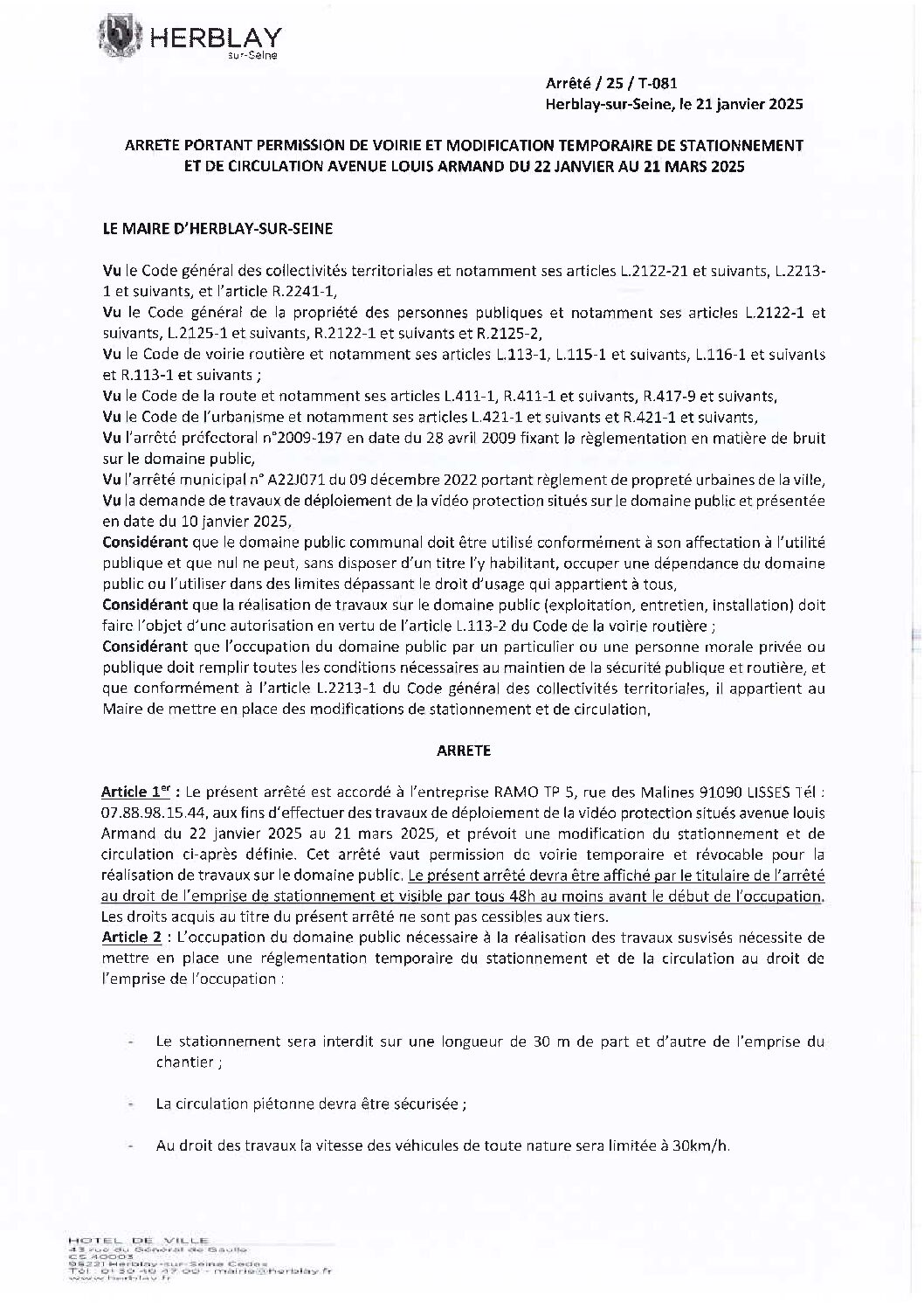 Arrêté portant permission de voirie et modification temporaire de stationnement et de circulation avenue Louis Armand