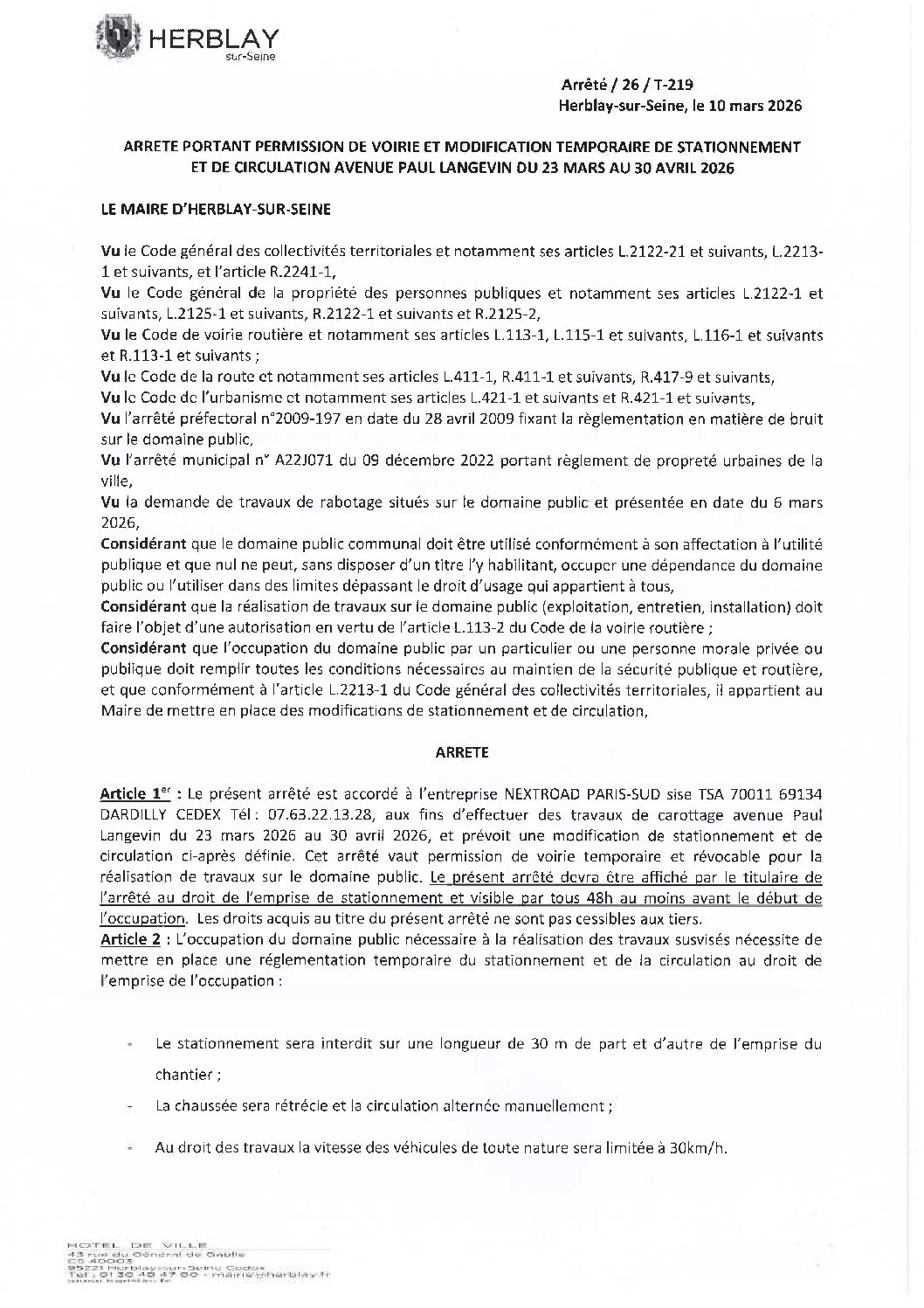 Arrêté portant permission de voirie et modification temporaire de stationnement et de circulation avenue Paul Langevin