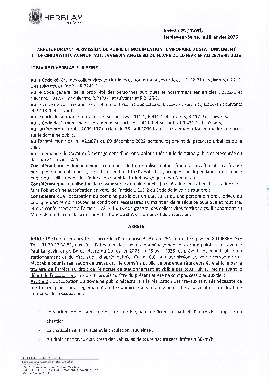 Arrêté portant permission de voirie et modification temporaire de stationnement et de circulation avenue Paul Langevin angle BD du Havre