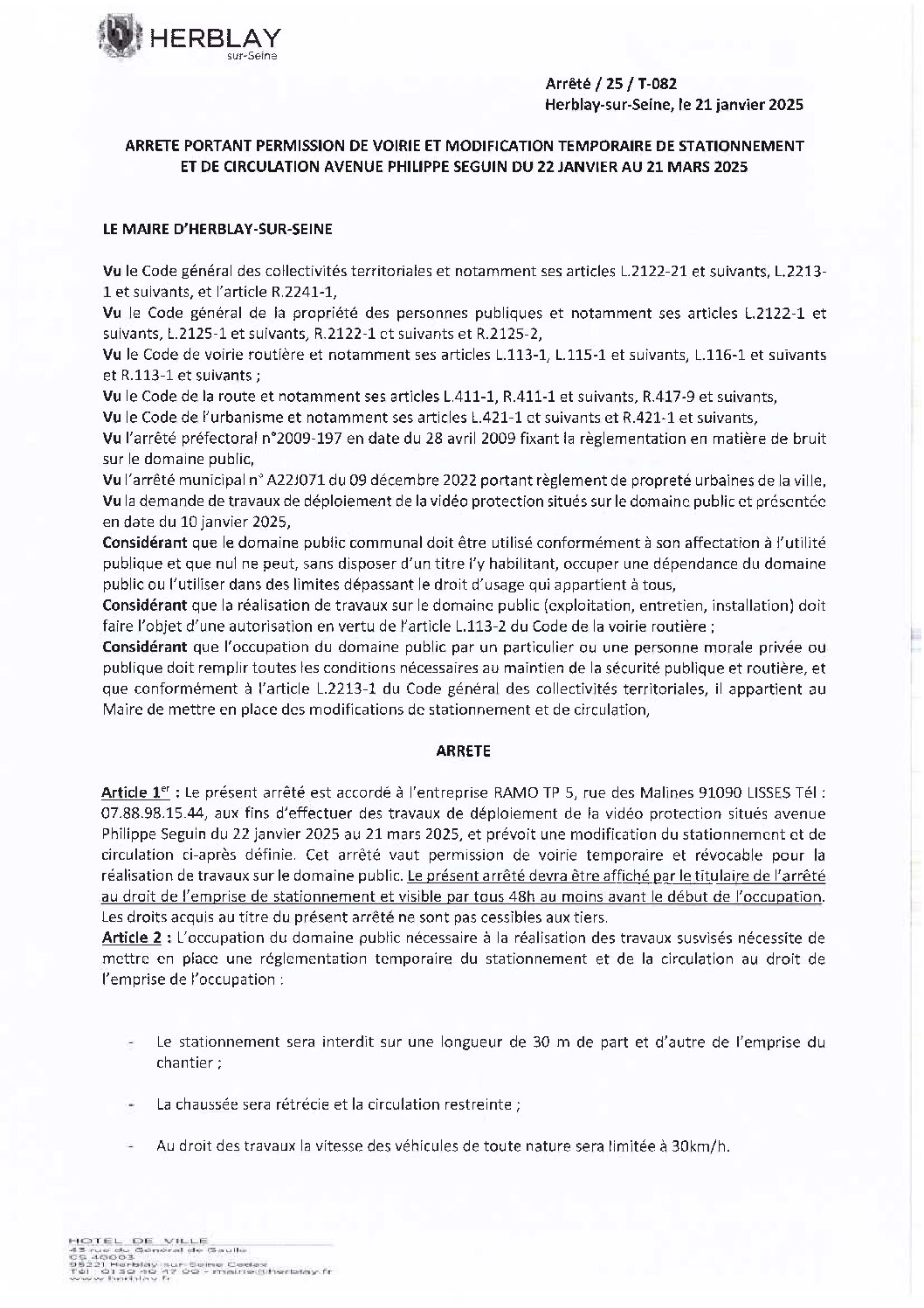 Arrêté portant permission de voirie et modification temporaire de stationnement et de circulation avenue Philippe Seguin