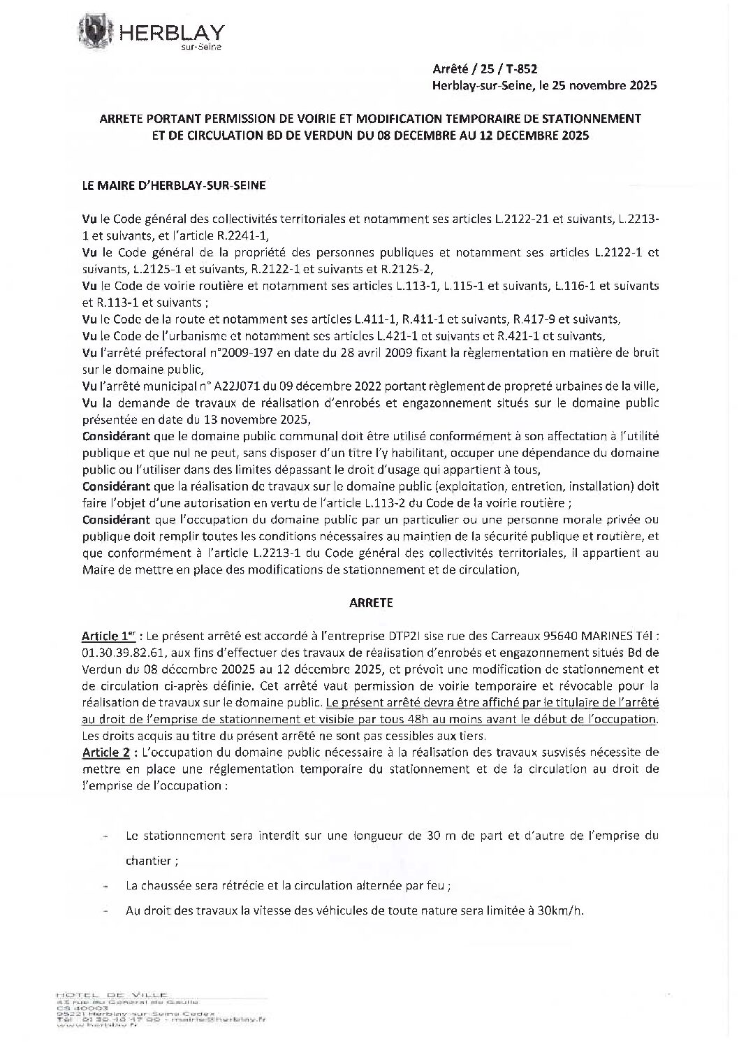 Arrêté portant permission de voirie et modification temporaire de stationnement et de circulation BD de Verdun