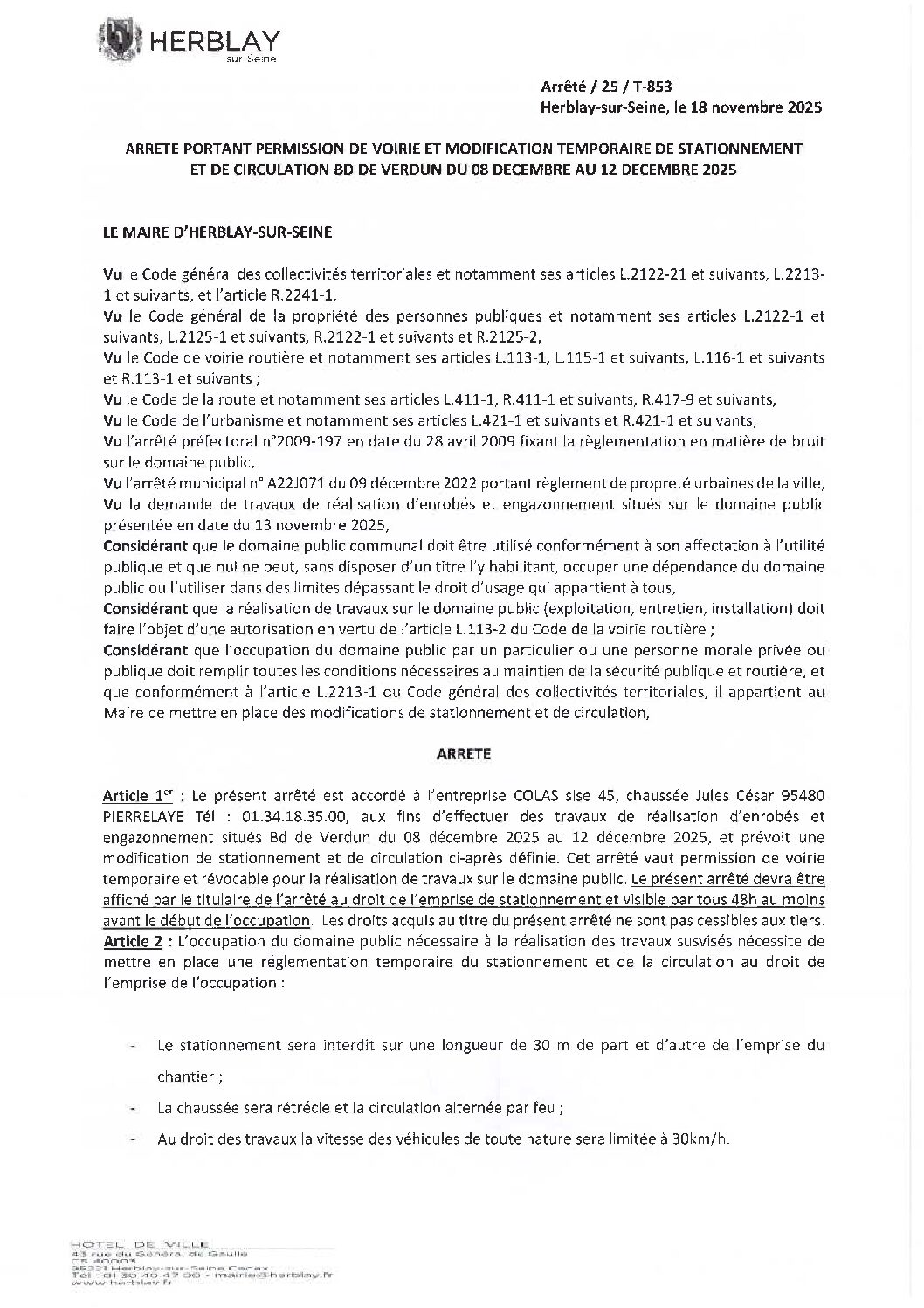 Arrêté portant permission de voirie et modification temporaire de stationnement et de circulation BD de Verdun