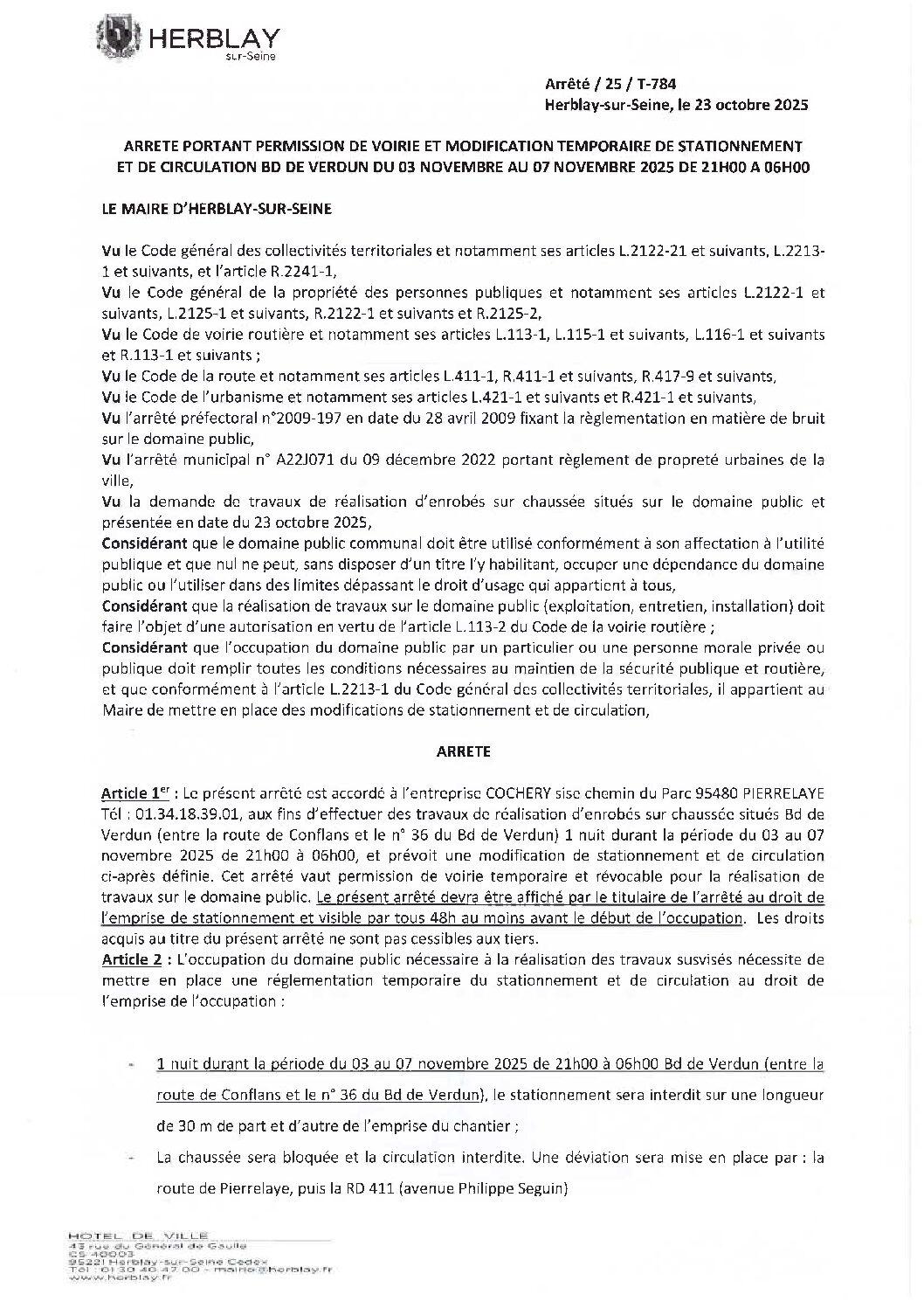 Arrêté portant permission de voirie et modification temporaire de stationnement et de circulation BD de Verdun
