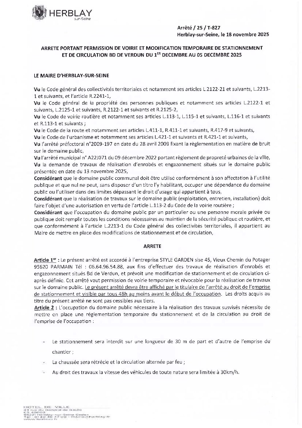 Arrêté portant permission de voirie et modification temporaire de stationnement et de circulation BD de Verdun
