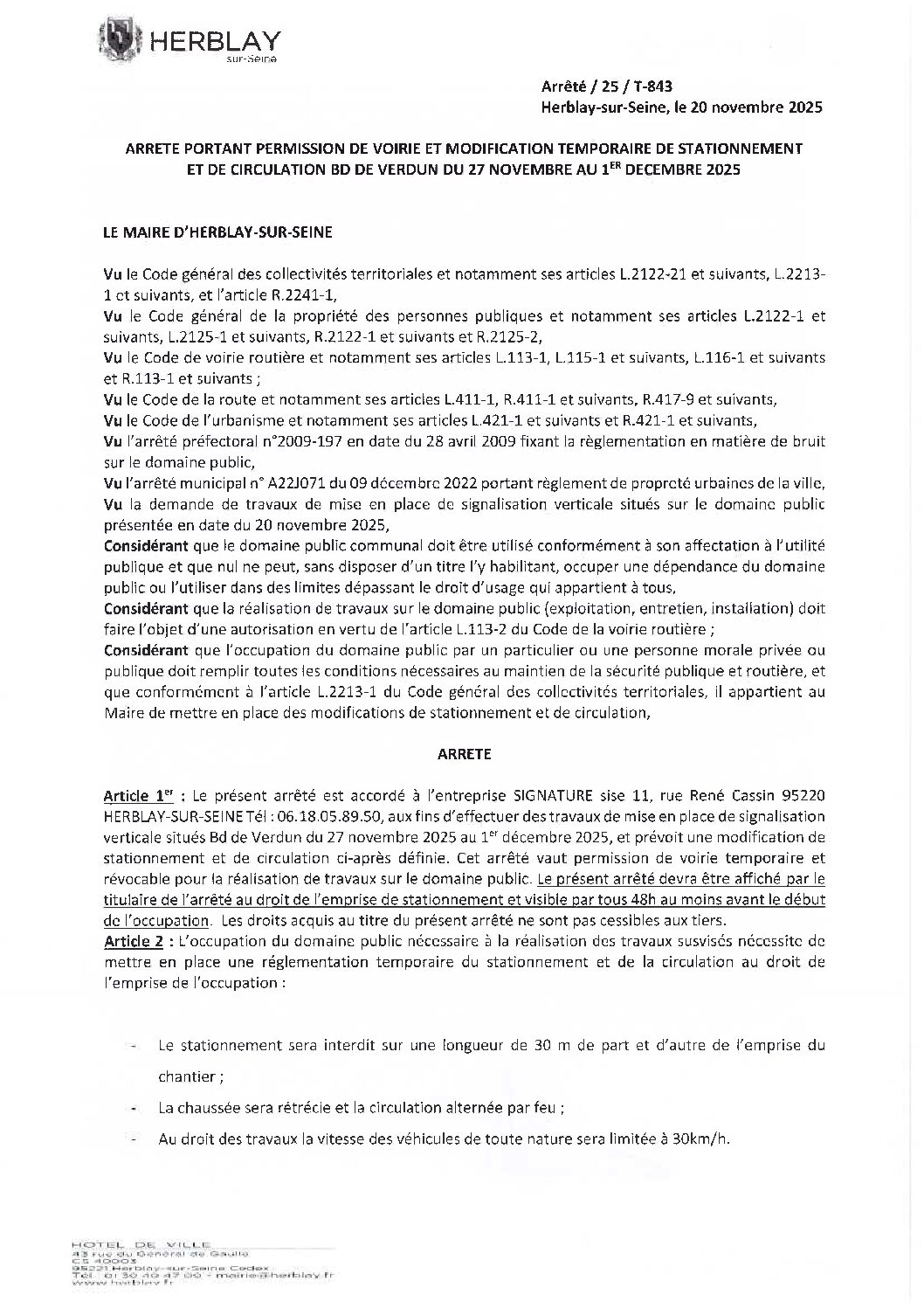 Arrêté portant permission de voirie et modification temporaire de stationnement et de circulation BD de Verdun