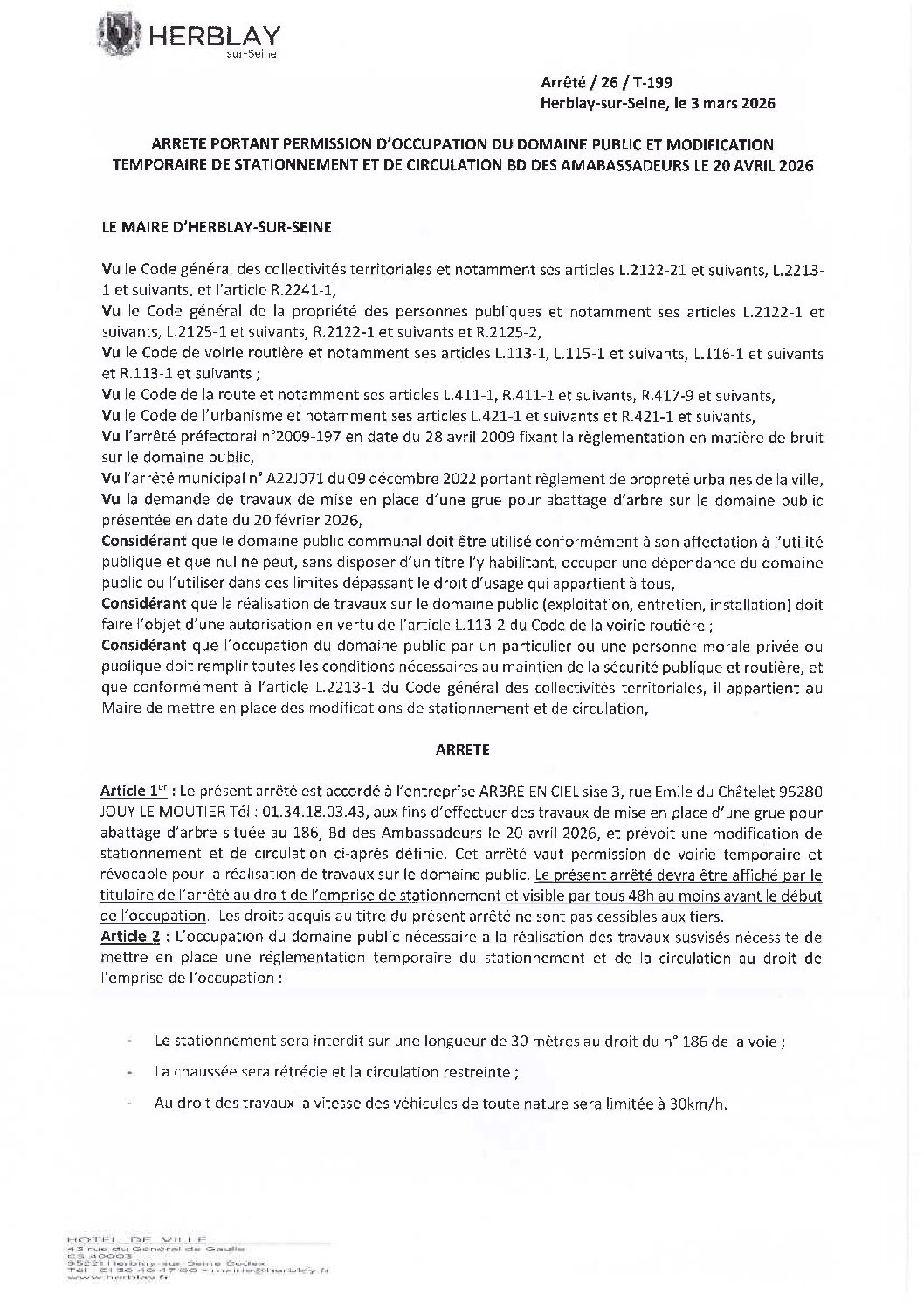 Arrêté portant permission de voirie et modification temporaire de stationnement et de circulation BD des Ambassadeurs