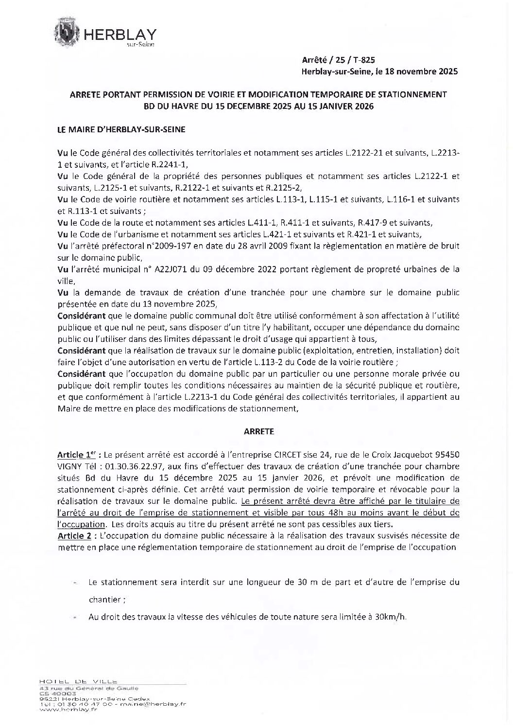 Arrêté portant permission de voirie et modification temporaire de stationnement et de circulation BD du Havre