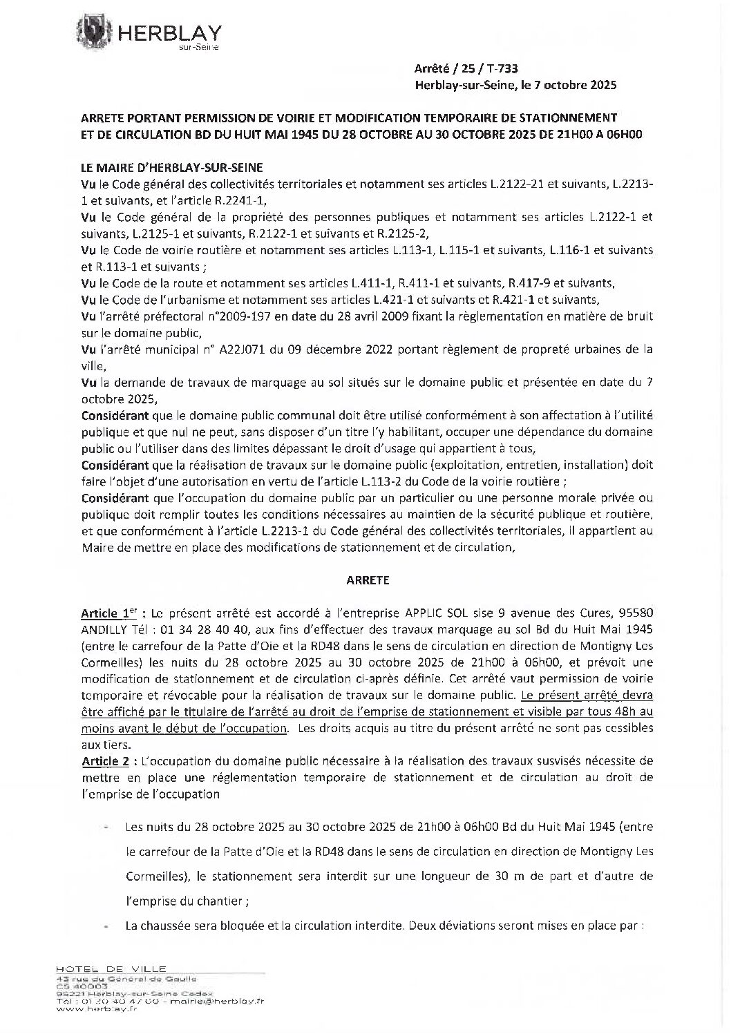 Arrêtés : Arrêté portant permission de voirie et modification temporaire de stationnement et de circulation BD du Huit Mai 1945 7 octobre 2025