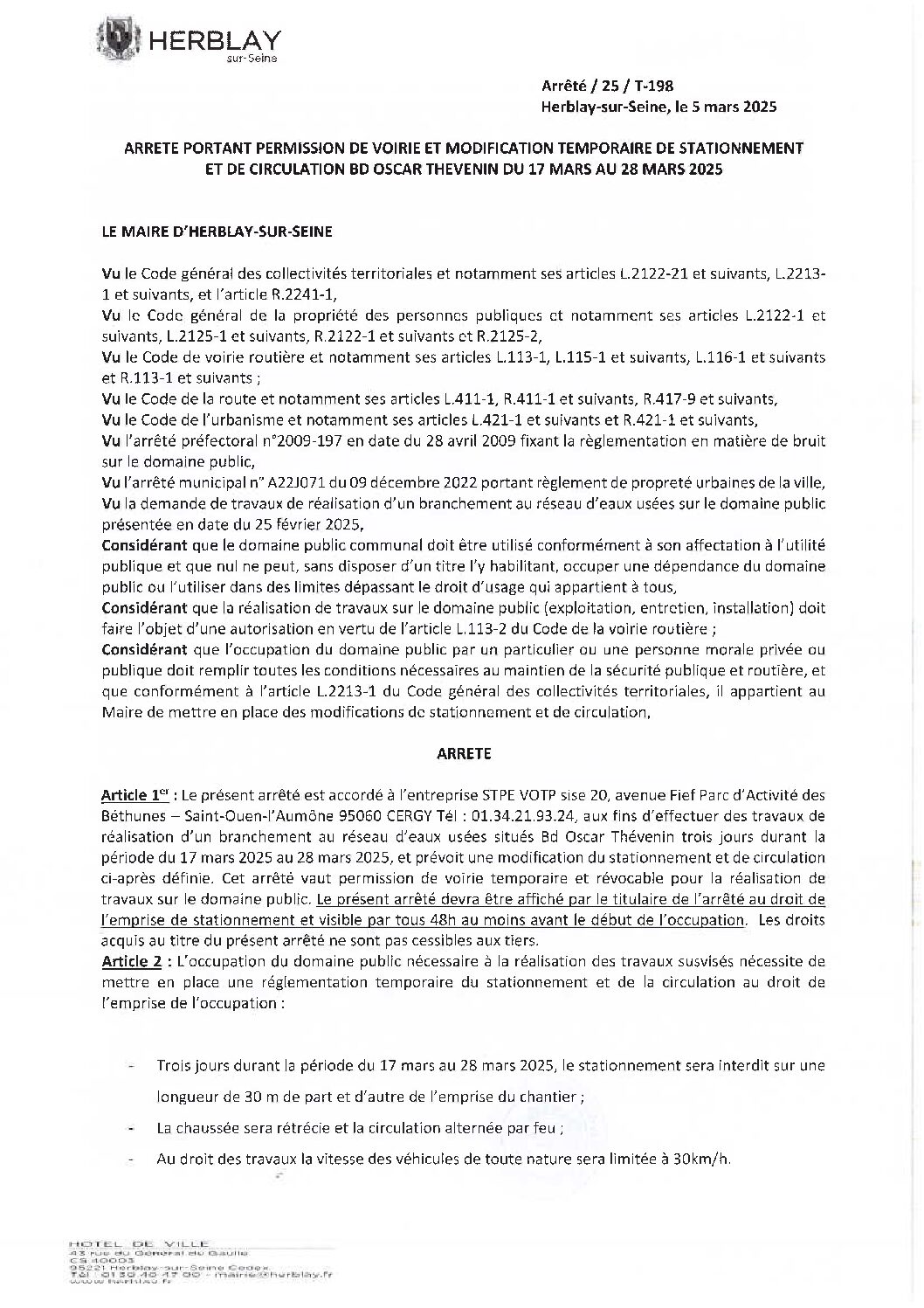 Arrêté portant permission de voirie et modification temporaire de stationnement et de circulation BD Oscar Thévenin